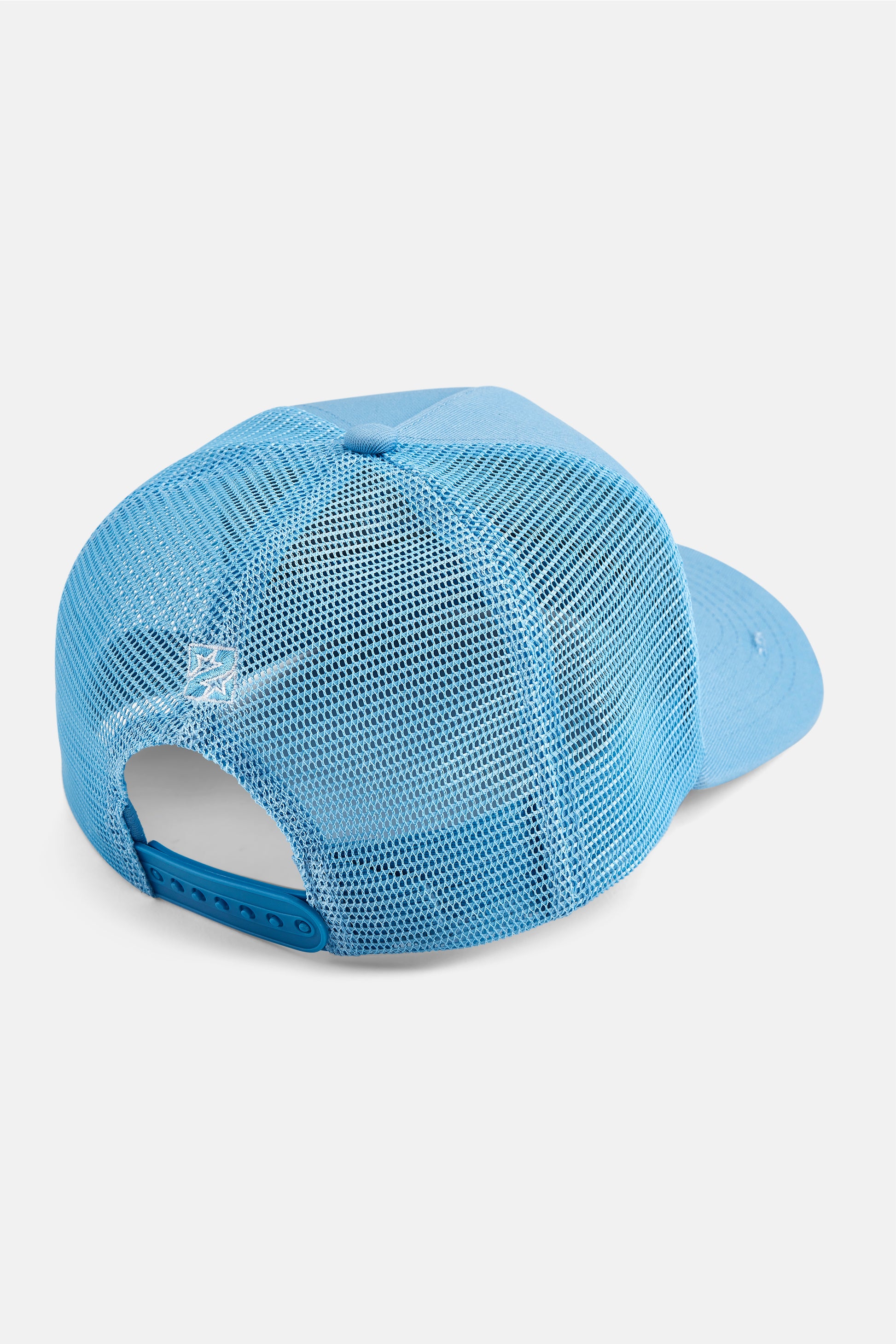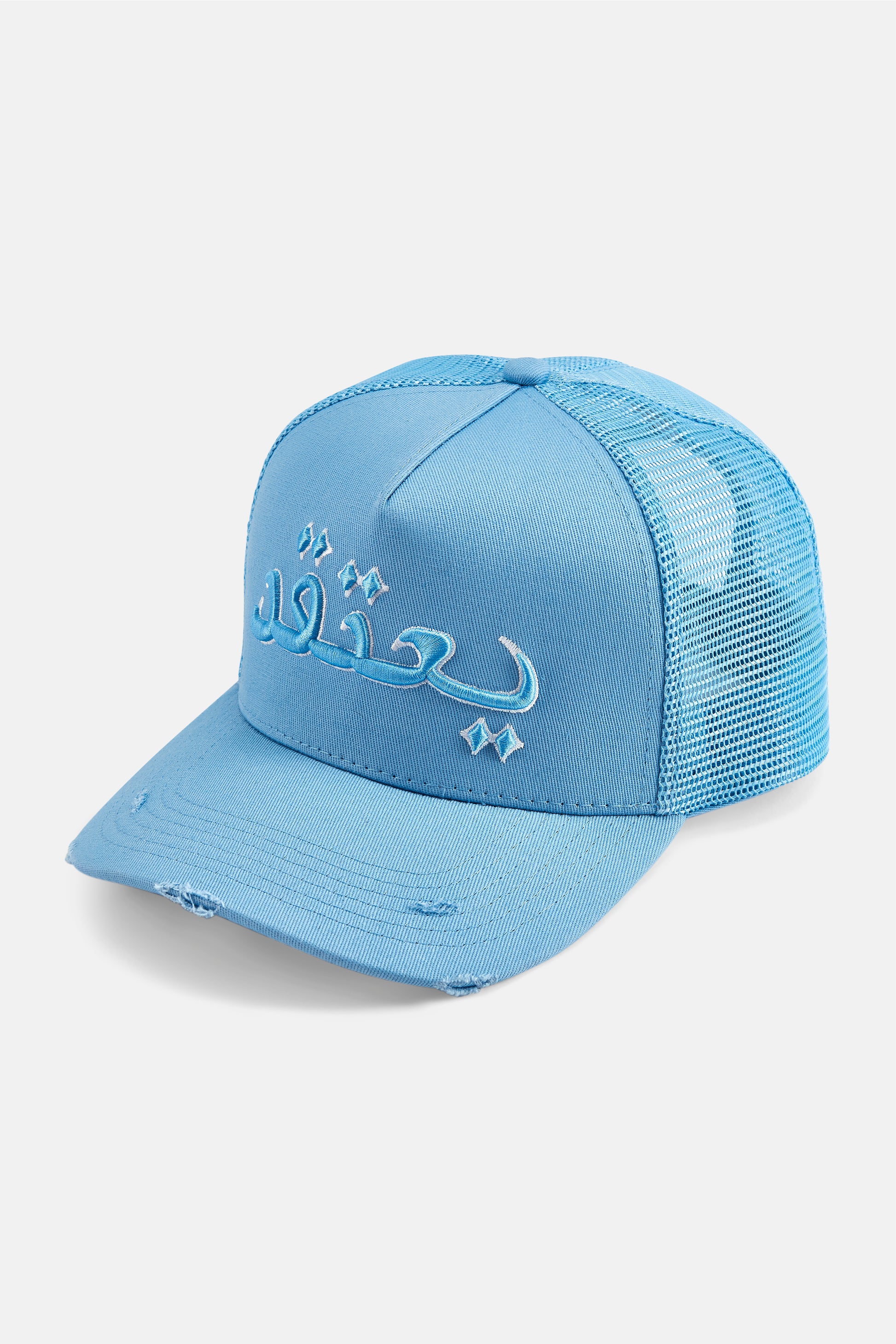 Baby Blue snapback cap with 'Believe' in Arabic text 3D embroidered onto front panel with tonal blue and white outline stitching. Featuring hand distressed peak, mesh back and Zoron Z Star logo embroidery.