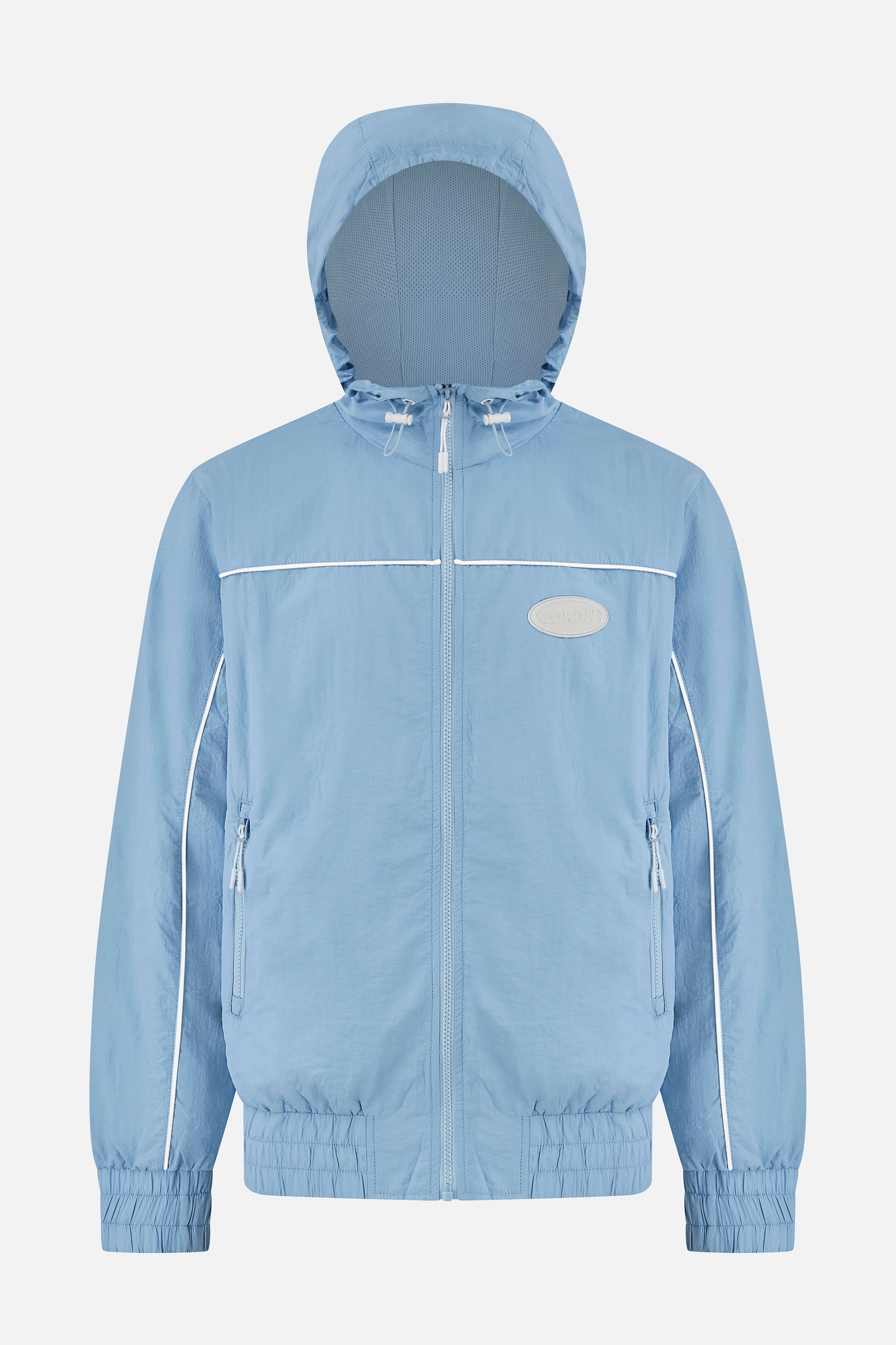 Ice blue lightweight and breathable jacket detailed with white reflective piping. Features signature Zoron logo patch on chest, zip front pockets and drawcord hood.