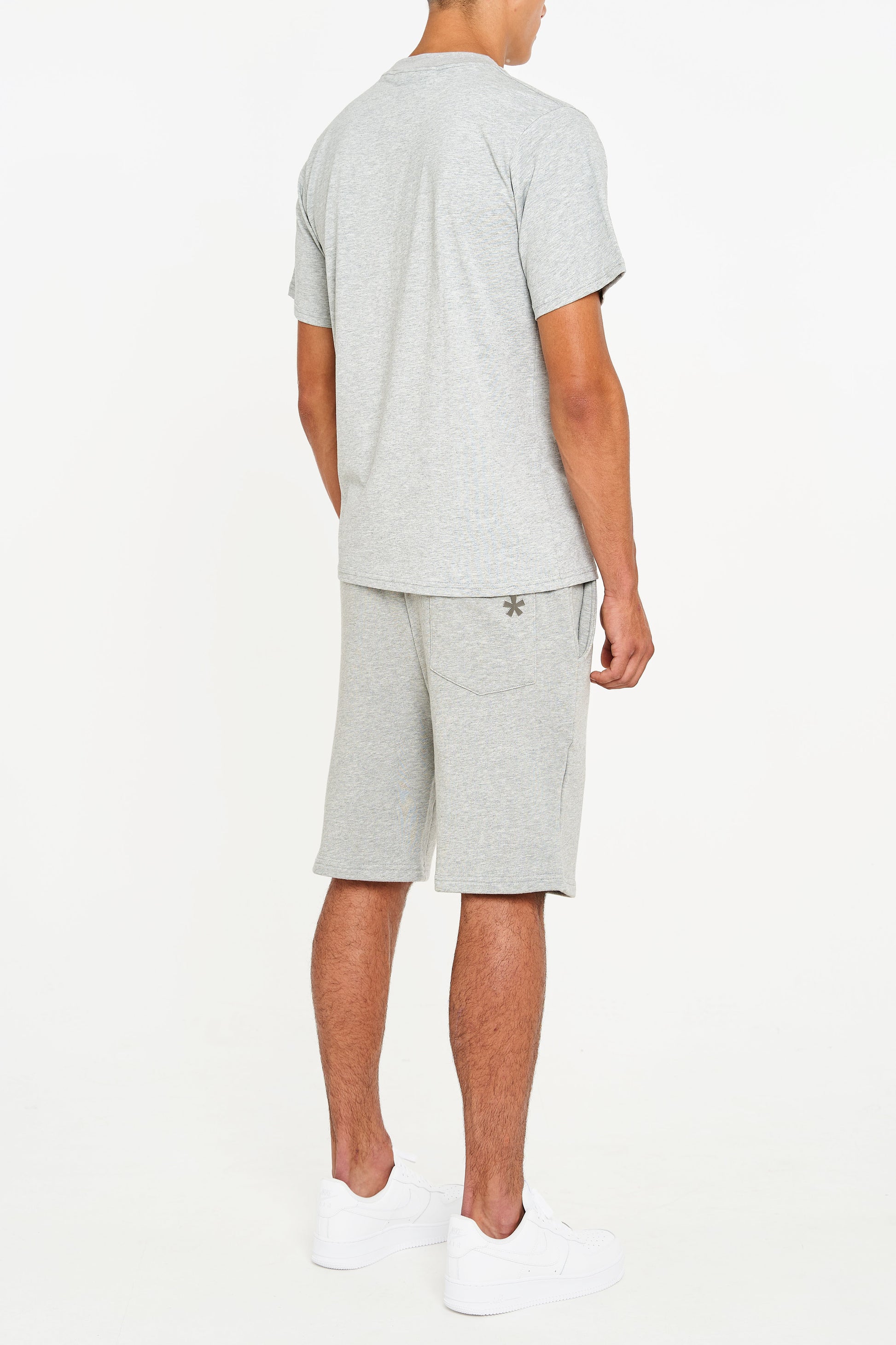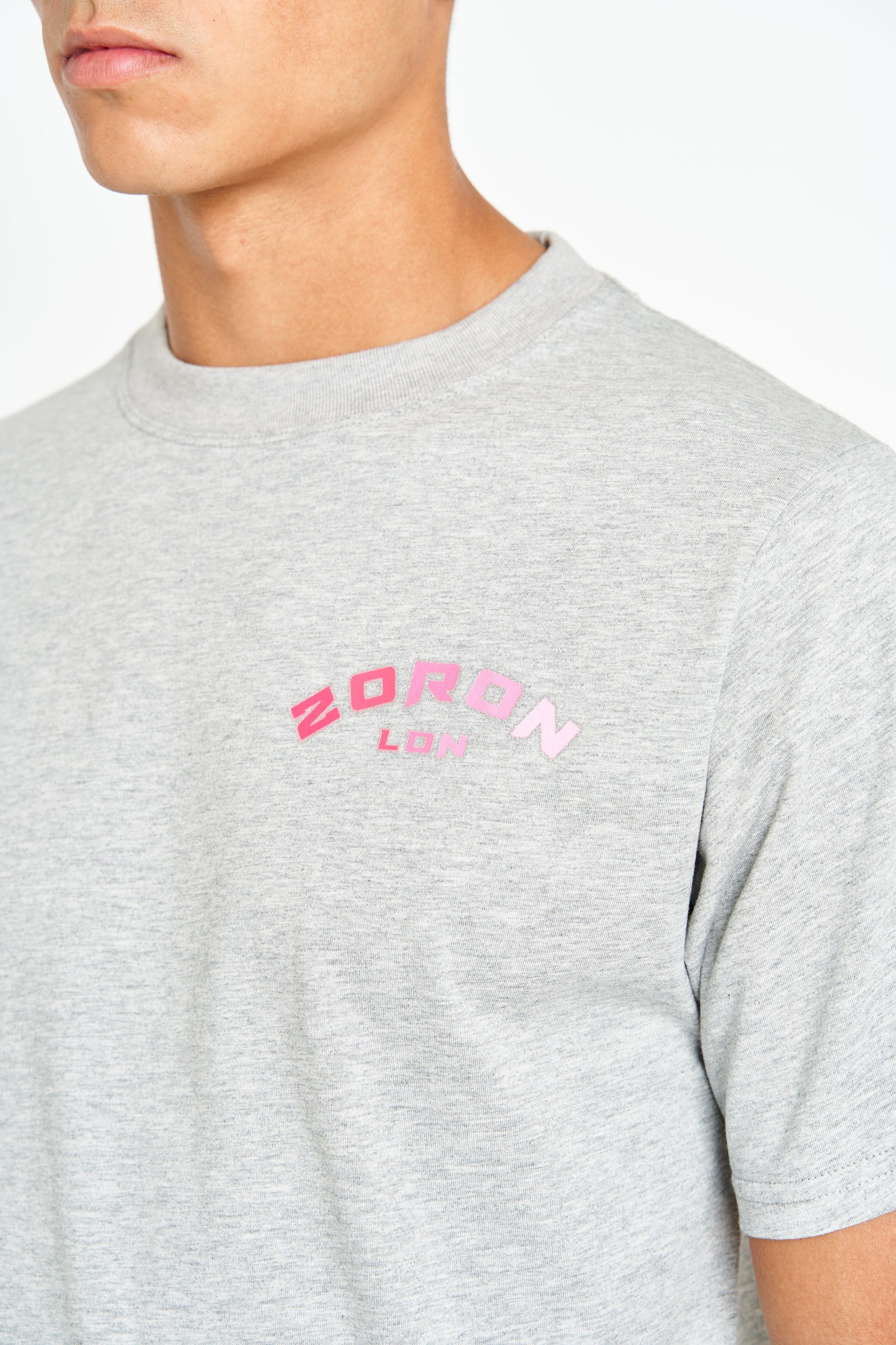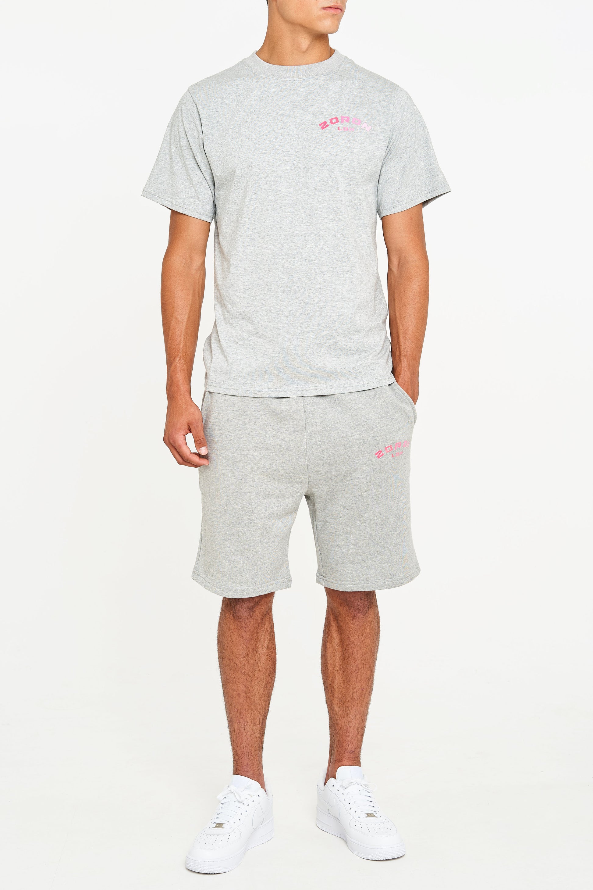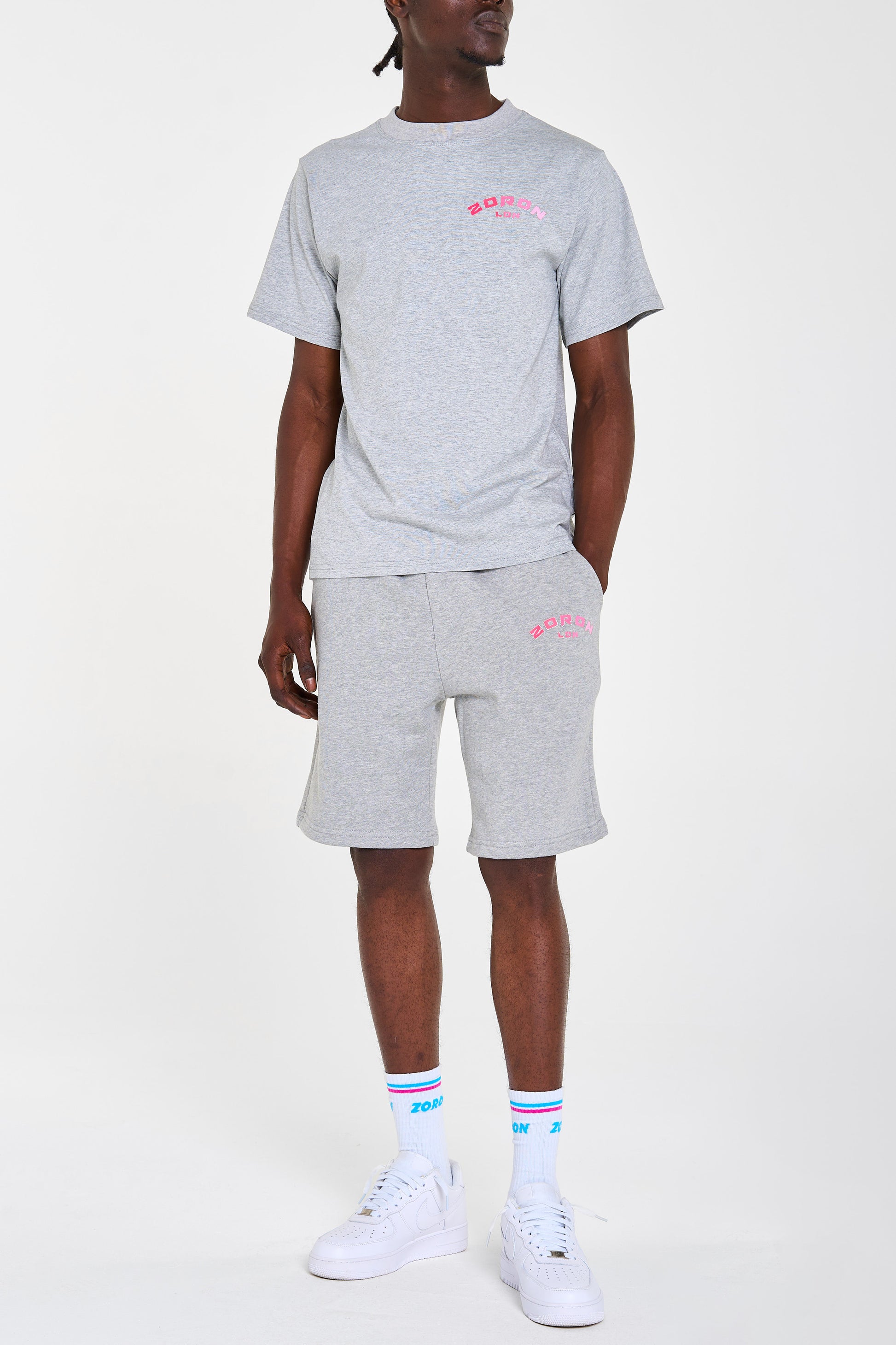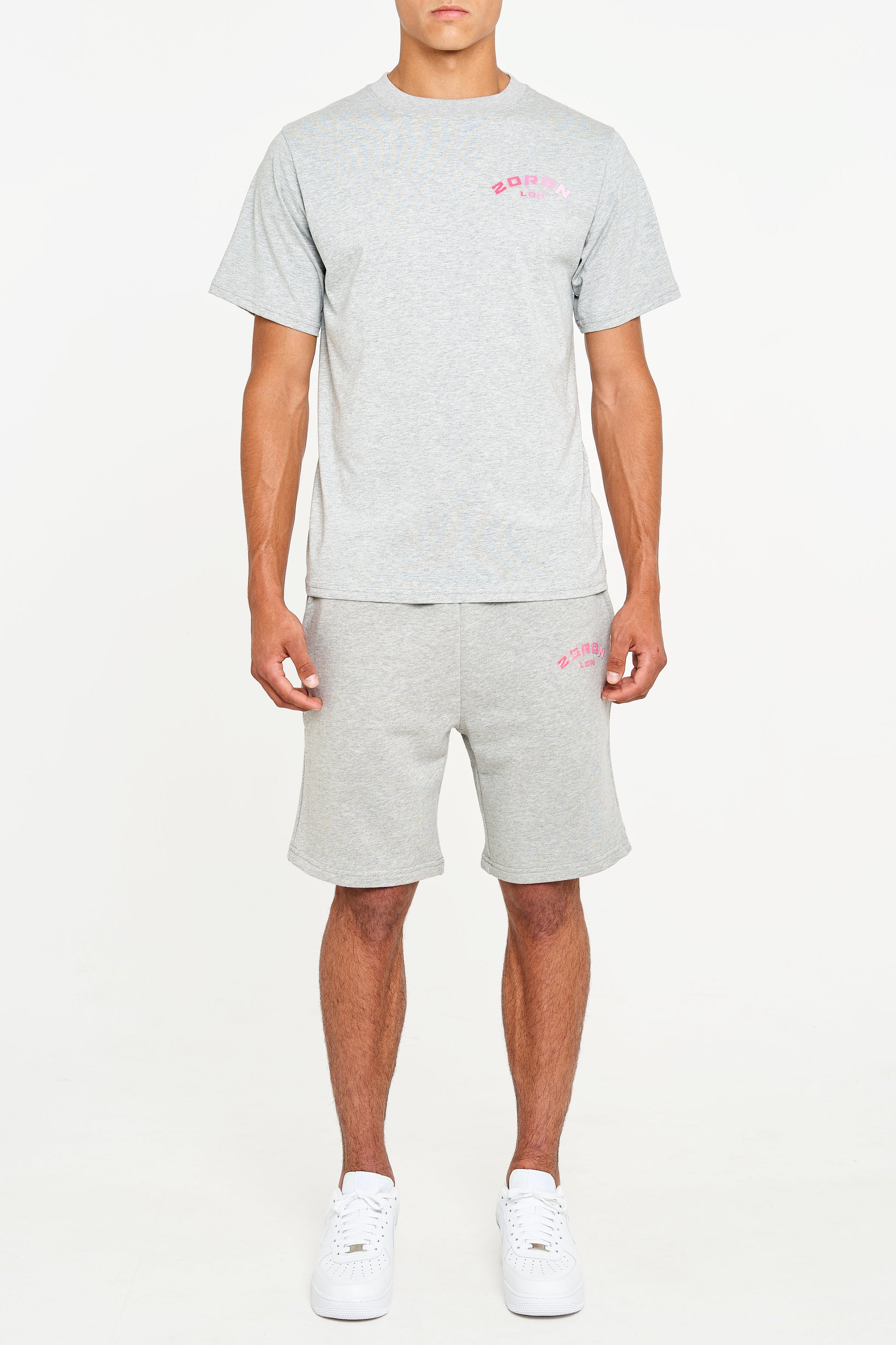 Grey shorts and t-shirt set made in a lightweight cotton, featuring Pink gradient & shine outline print. Elasticated waistband shorts include a signature Zoron metal tab logo on back pocket.