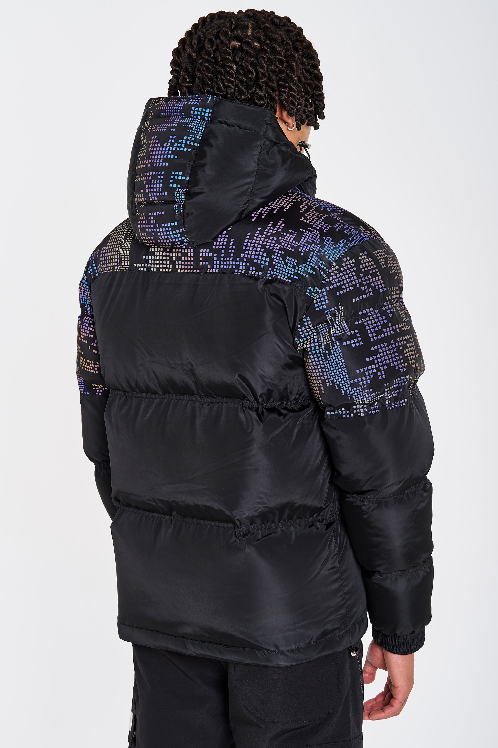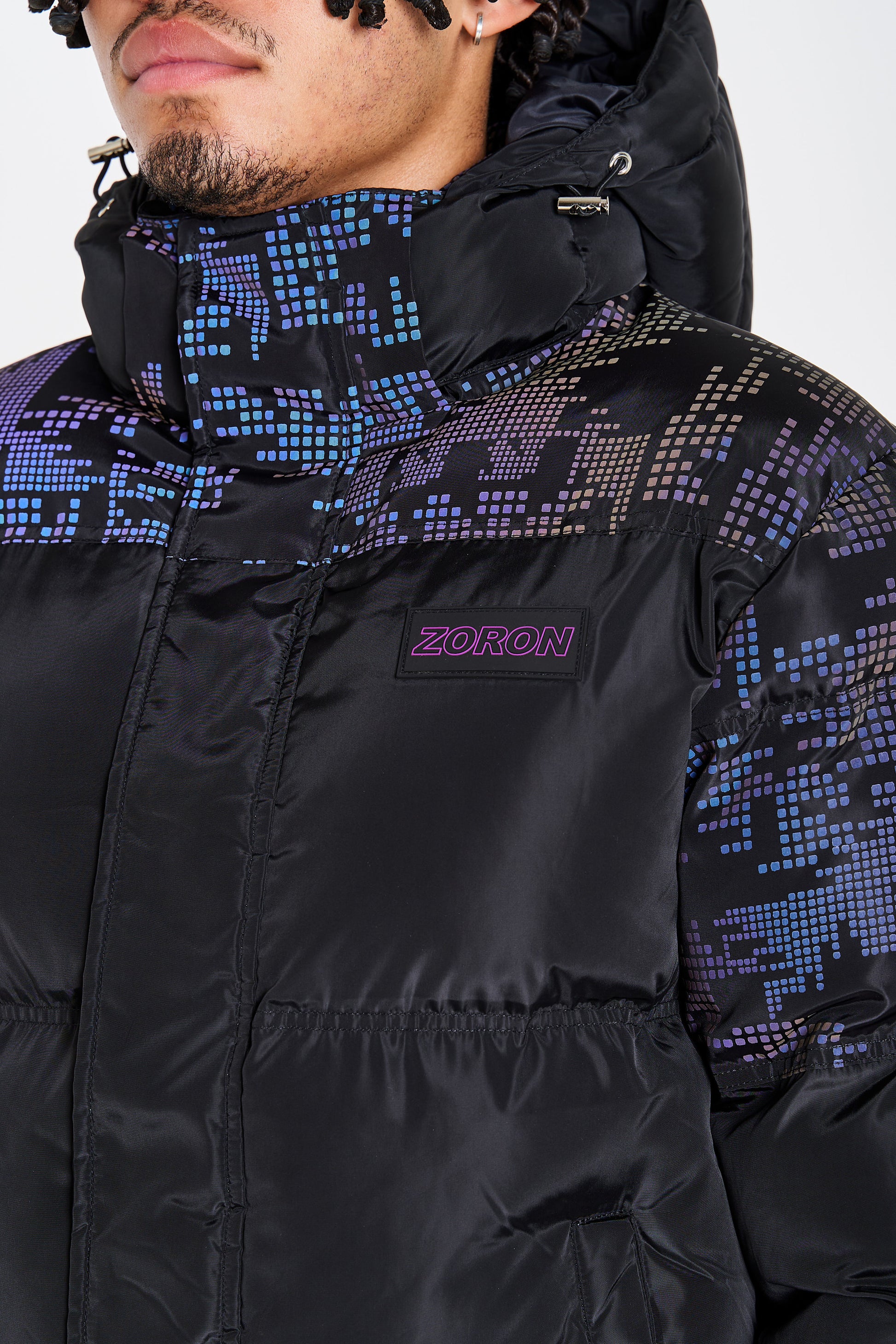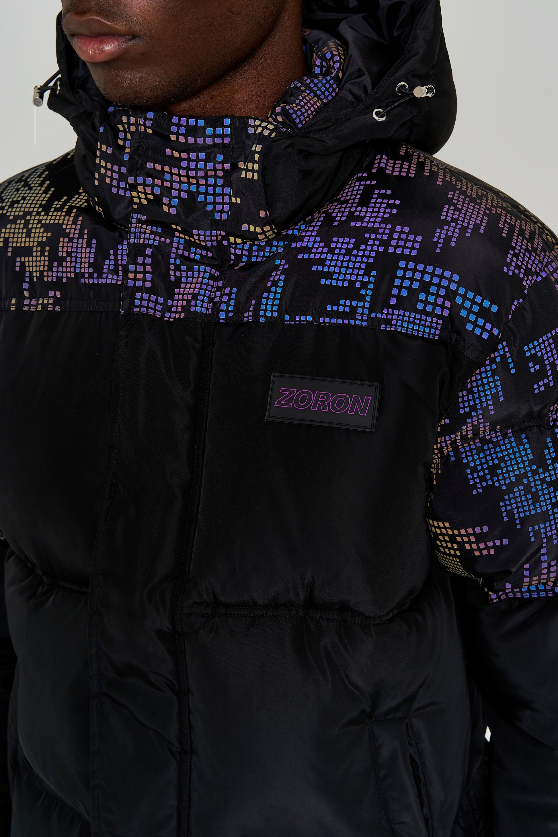 Black puffer jacket featuring special reflective fabric that shows purple/blue/orange/green colour under certain light and flash. Features Zoron rubber patch on left chest. Please note, due to the nature of the fabric, colour variation may slightly differ from the pictures advertised. Each piece is completely unique.