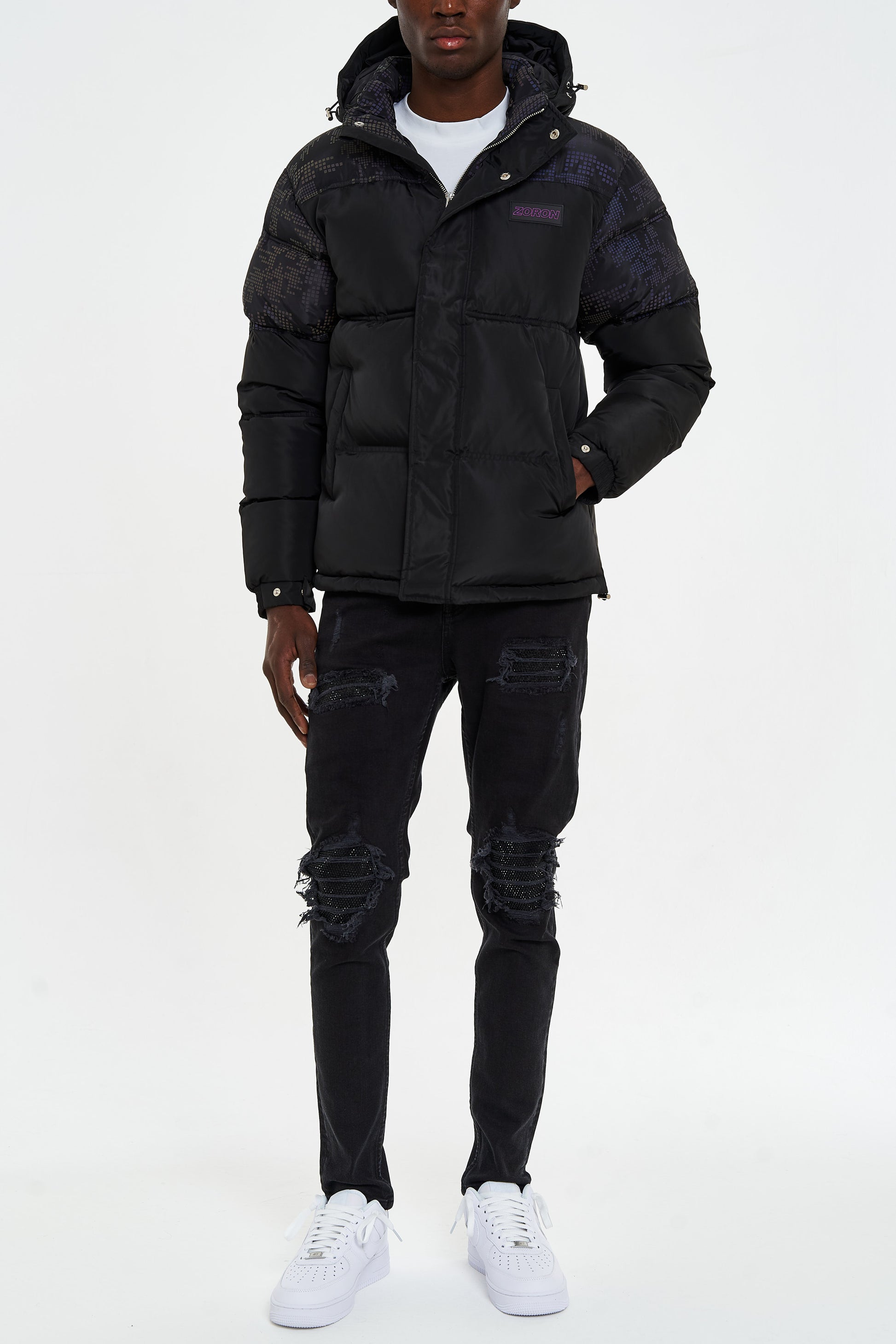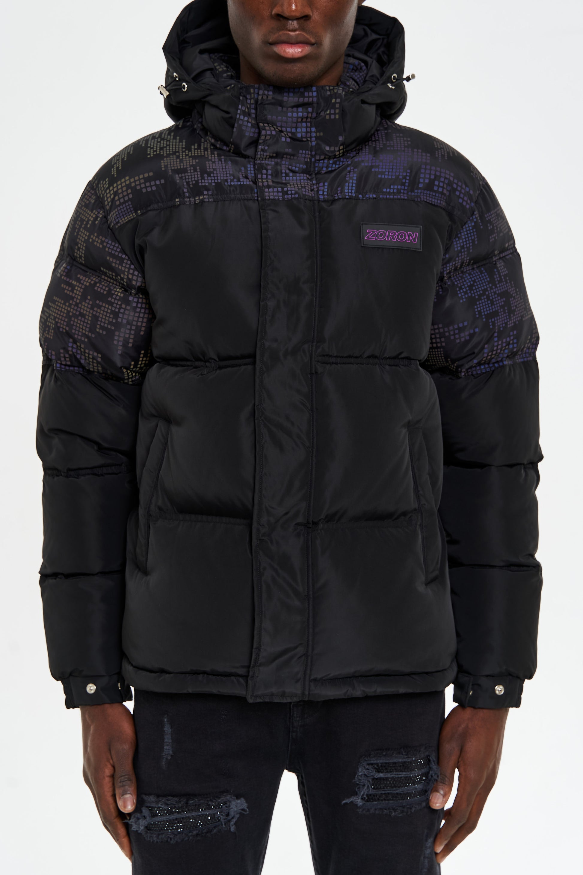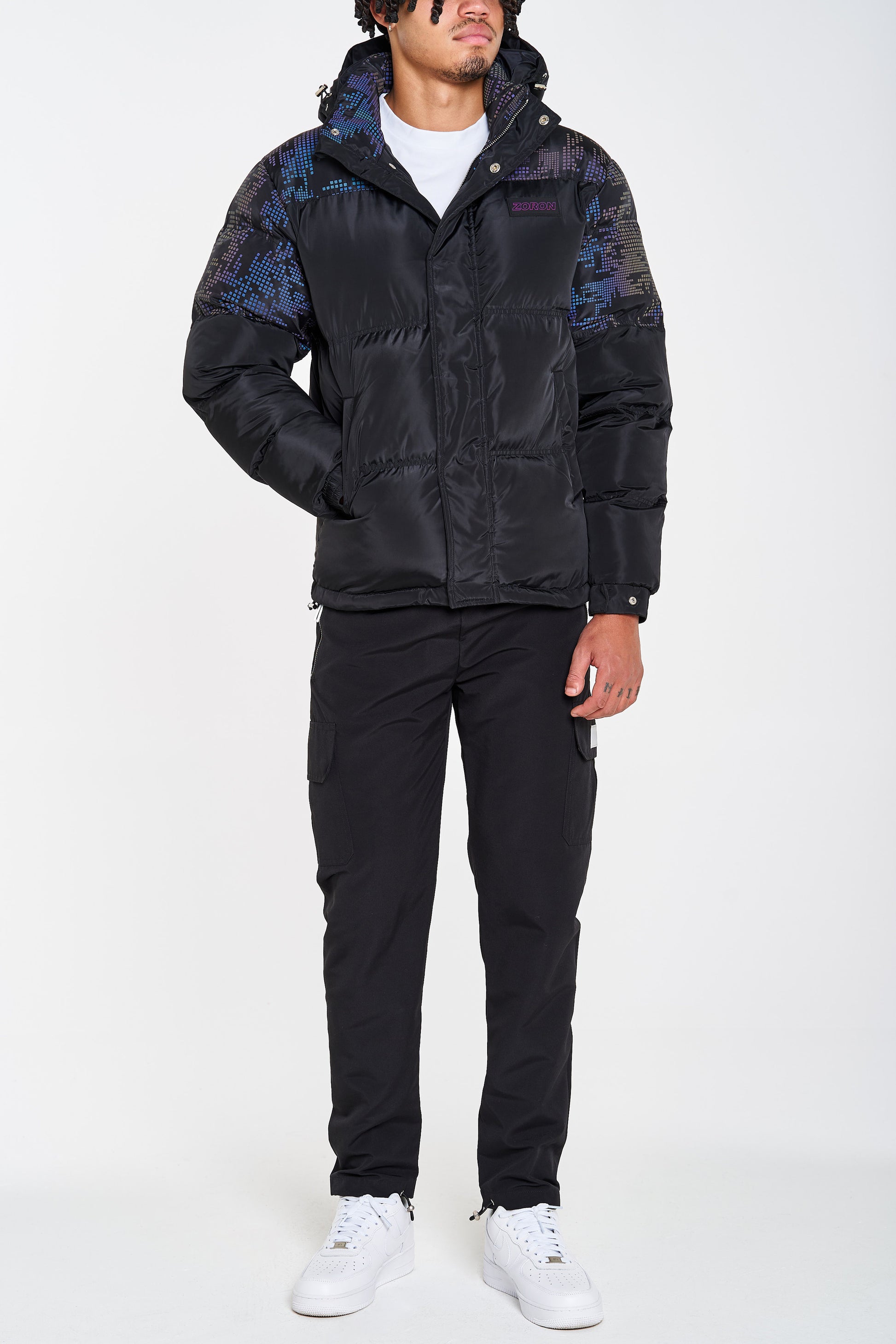 Black puffer jacket featuring special reflective fabric that shows purple/blue/orange/green colour under certain light and flash. Features Zoron rubber patch on left chest. Please note, due to the nature of the fabric, colour variation may slightly differ from the pictures advertised. Each piece is completely unique.