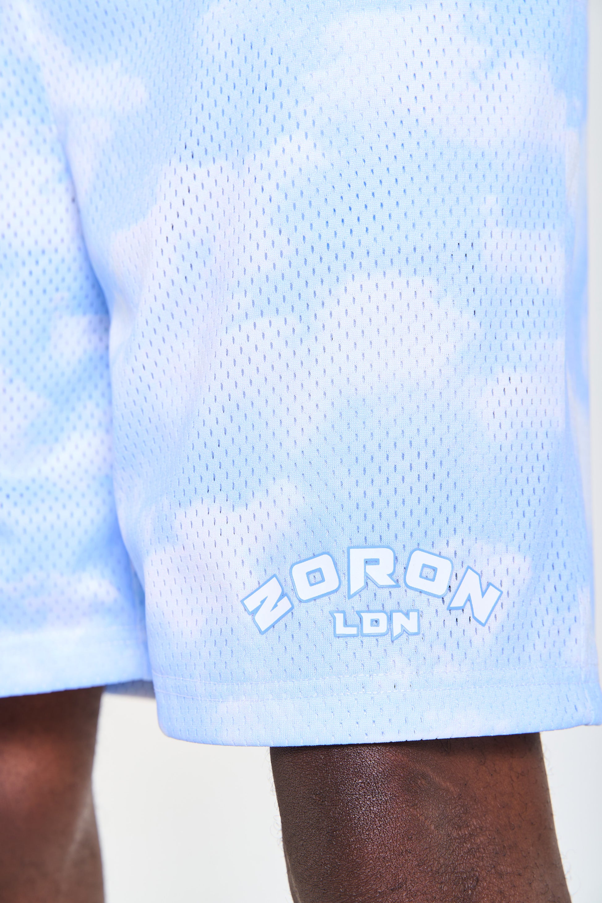 Sky Blue Mesh shorts made using a perforated fabric featuring Zoron screen print logo on left leg. Shorts are lined so they are not see through.