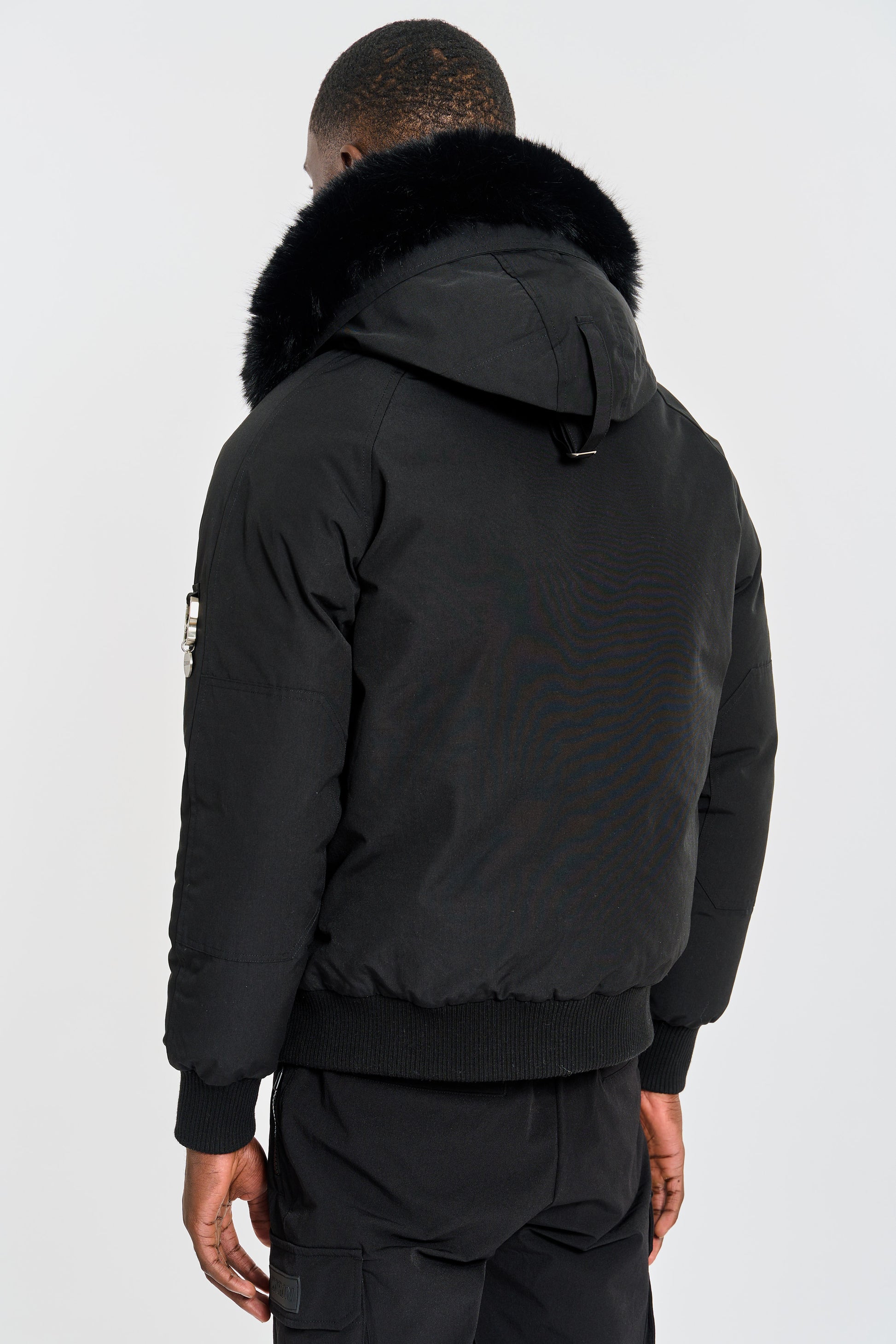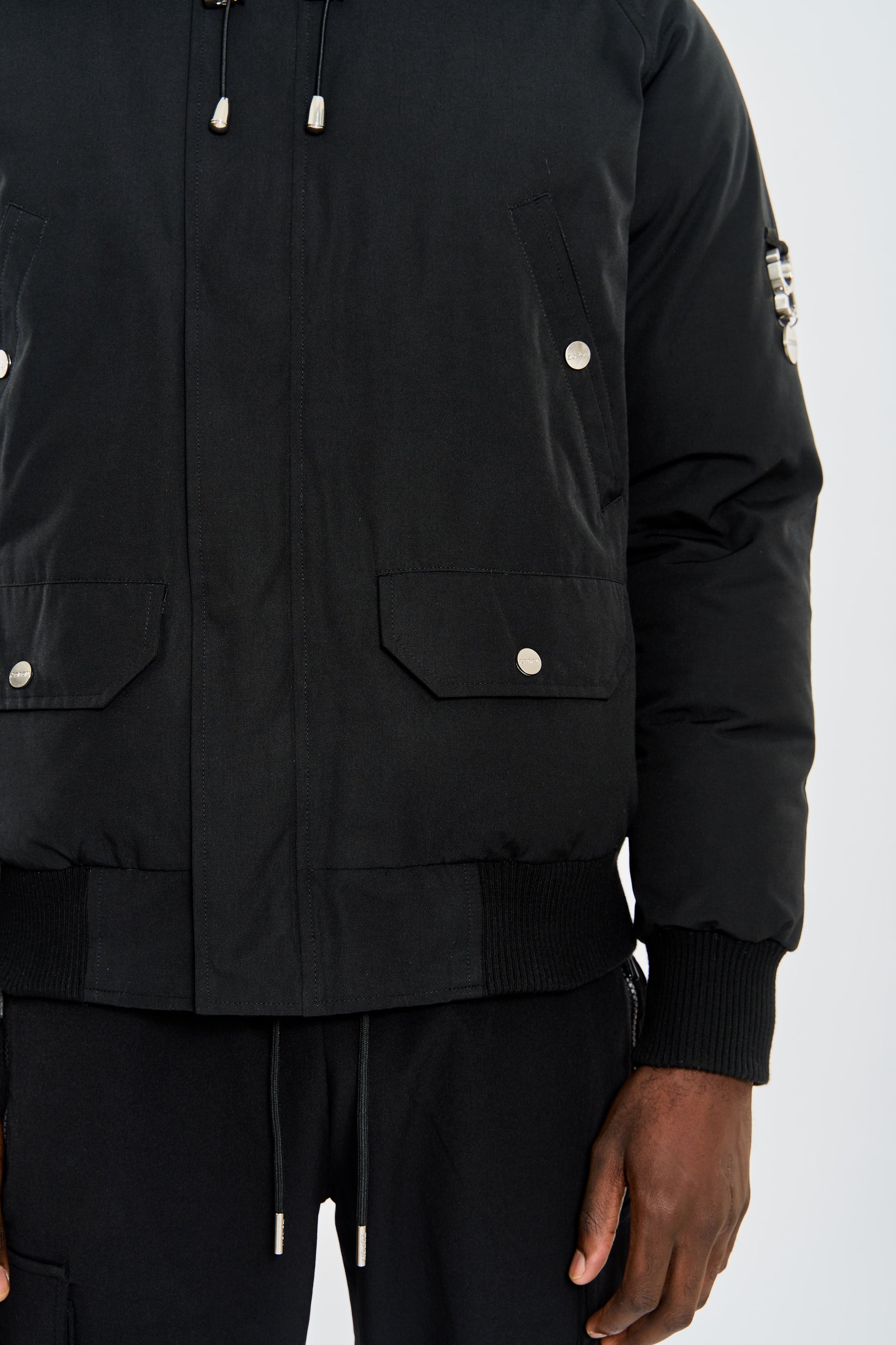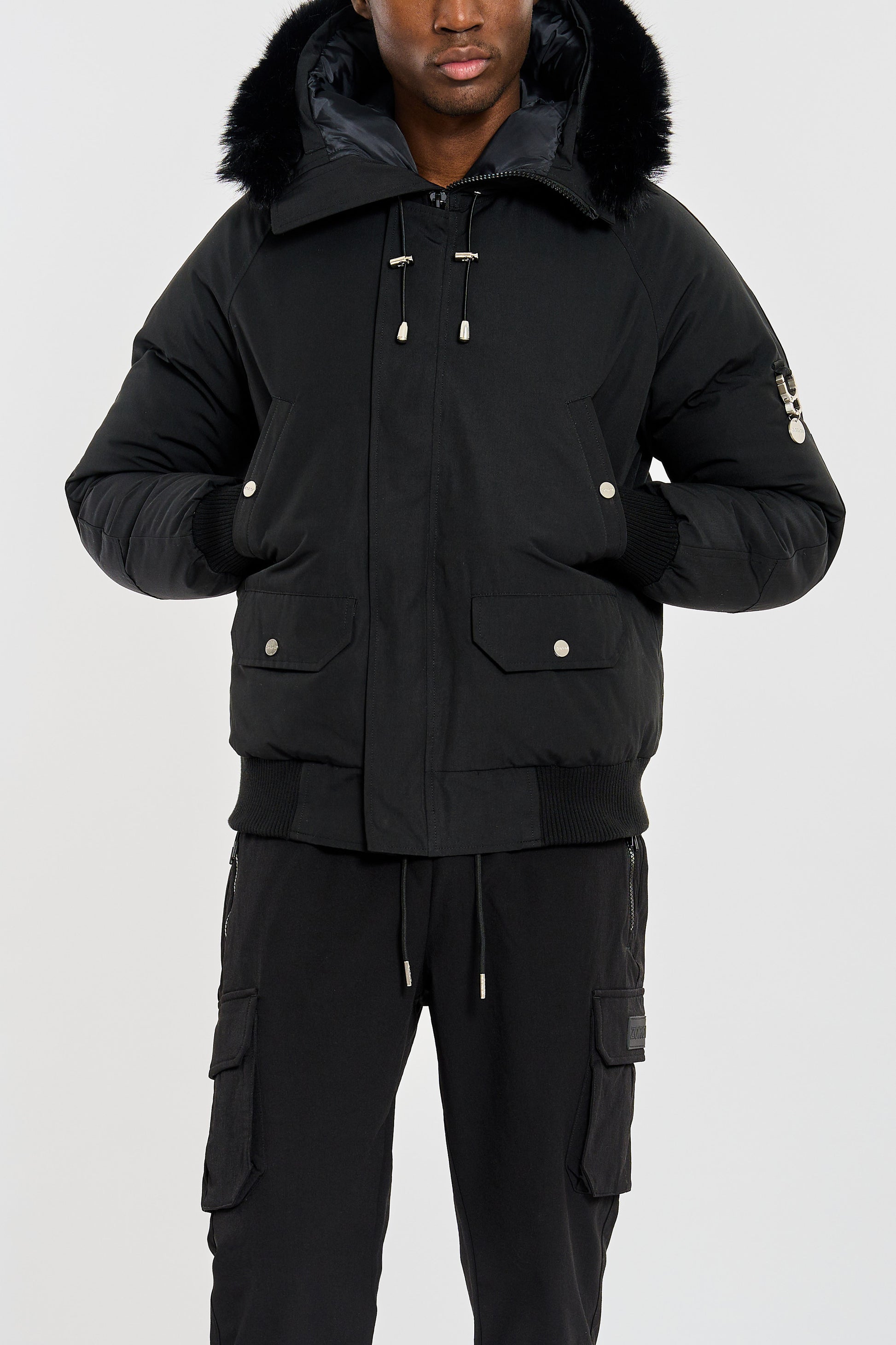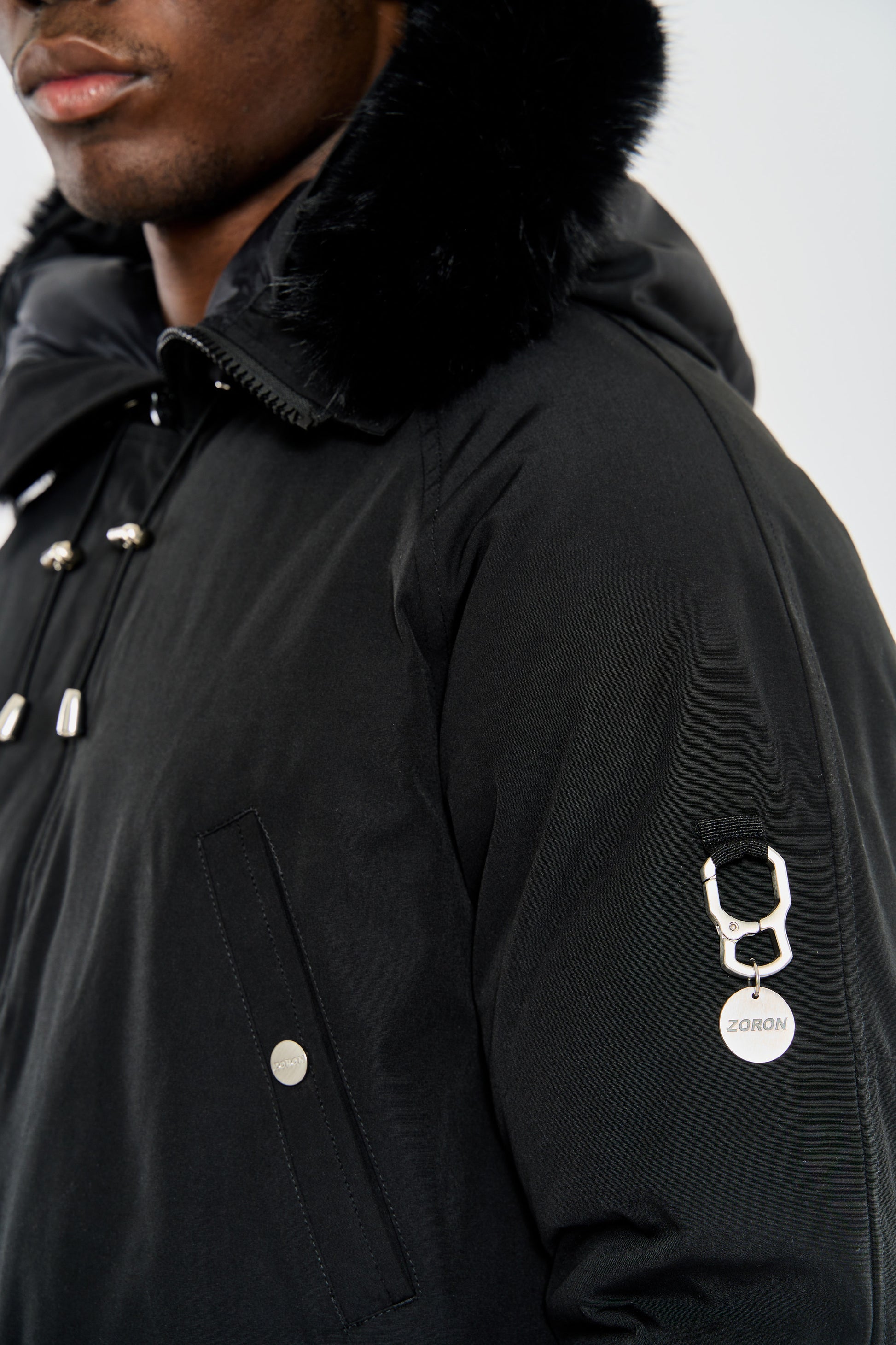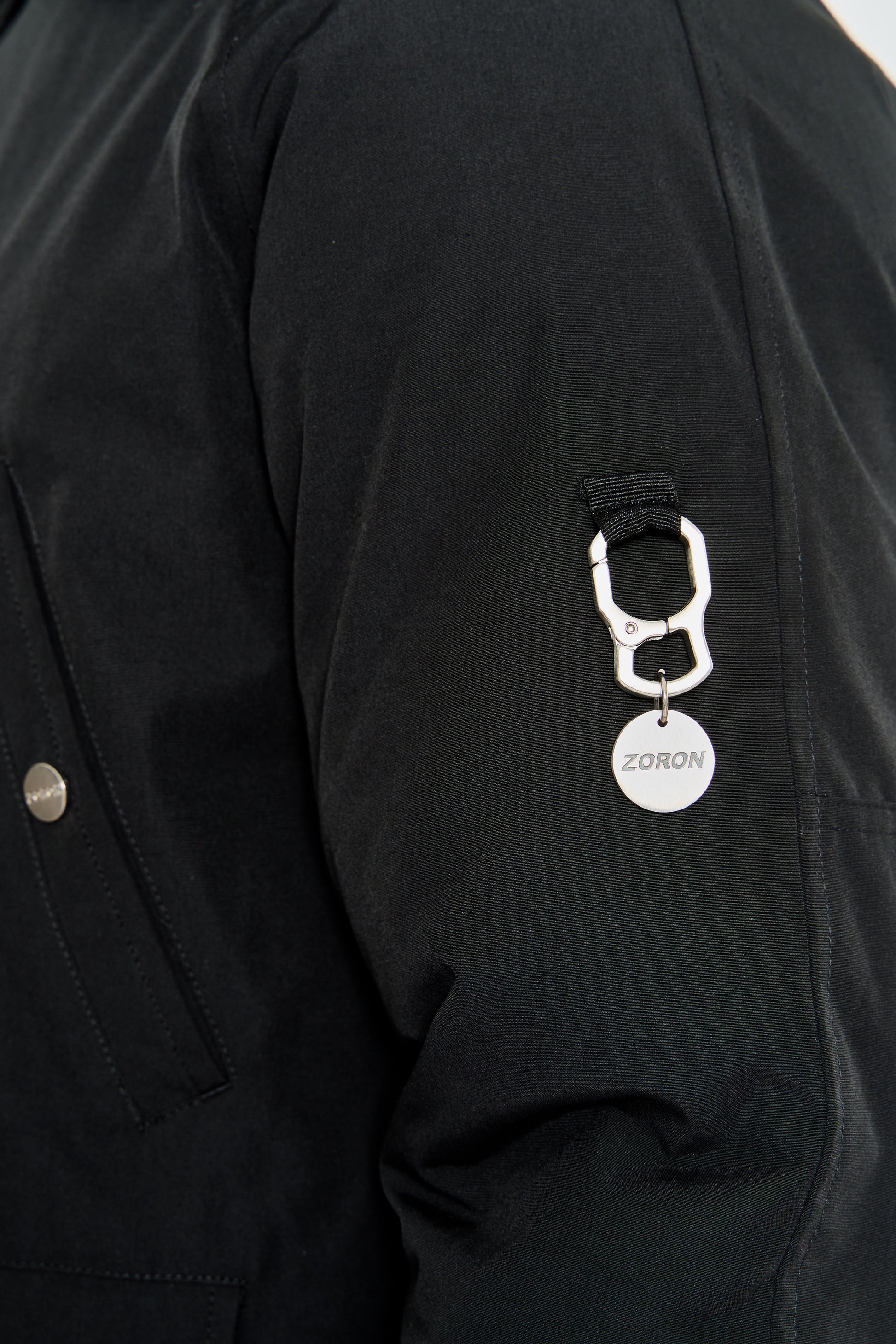 Black water resistant Eskimo jacket featuring black faux hood. Features signature Zoron key lock on left sleeve and two front slant pockets. You can also purchase purple or turquoise Eskimo separately to attach to this jacket.