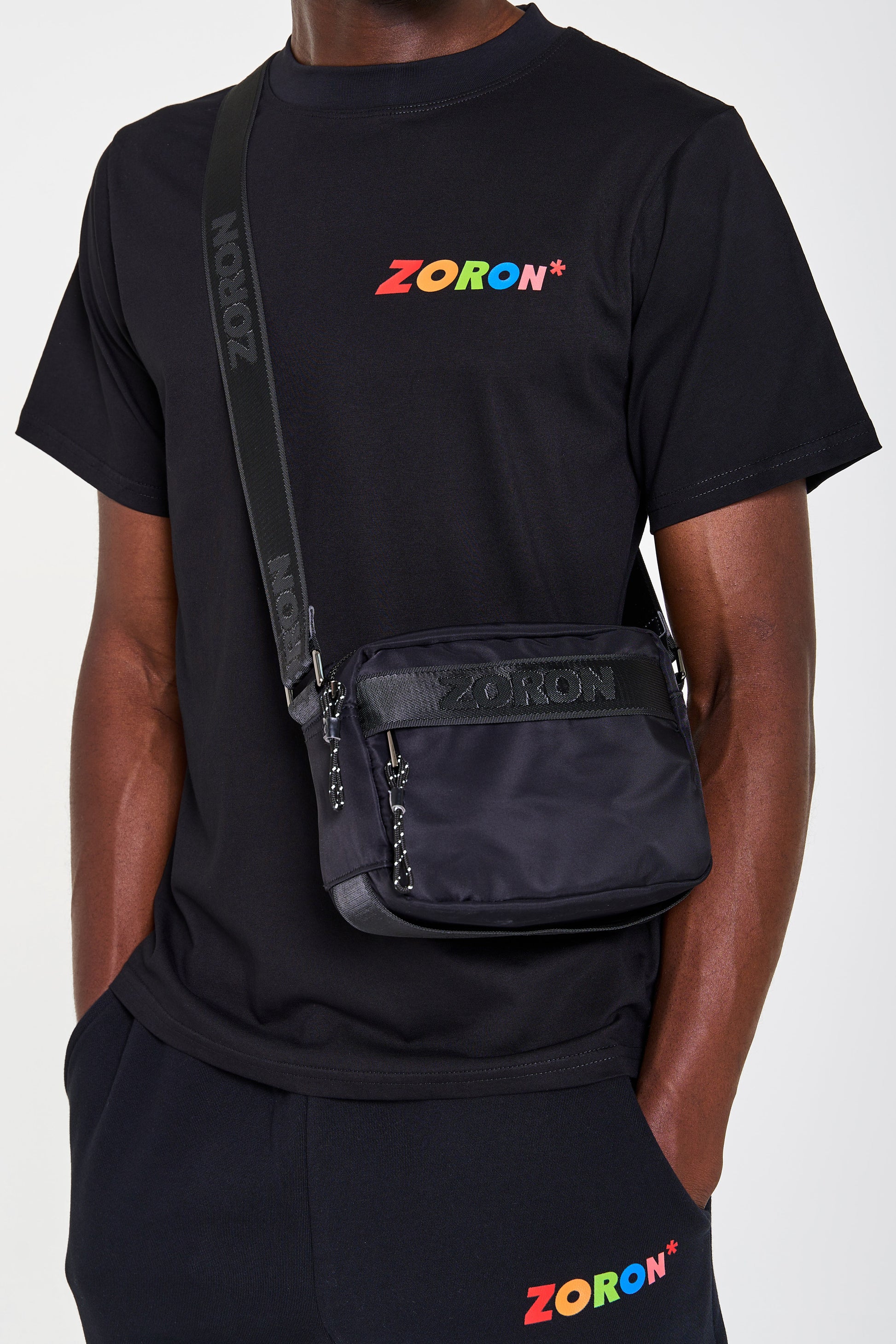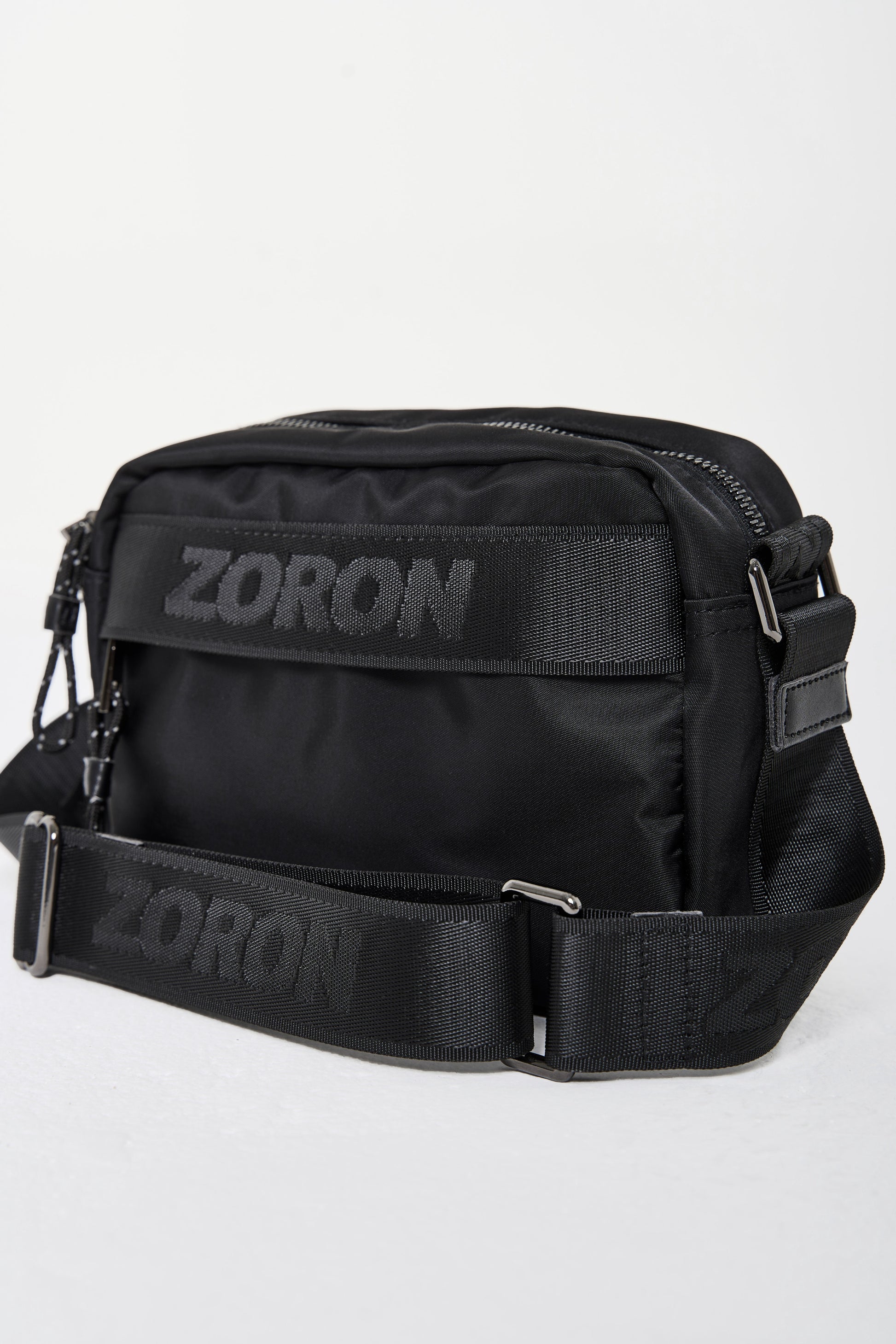 Black Messenger bag featuring custom Zoron strap, gun metal hardware and reflective zip pulls.