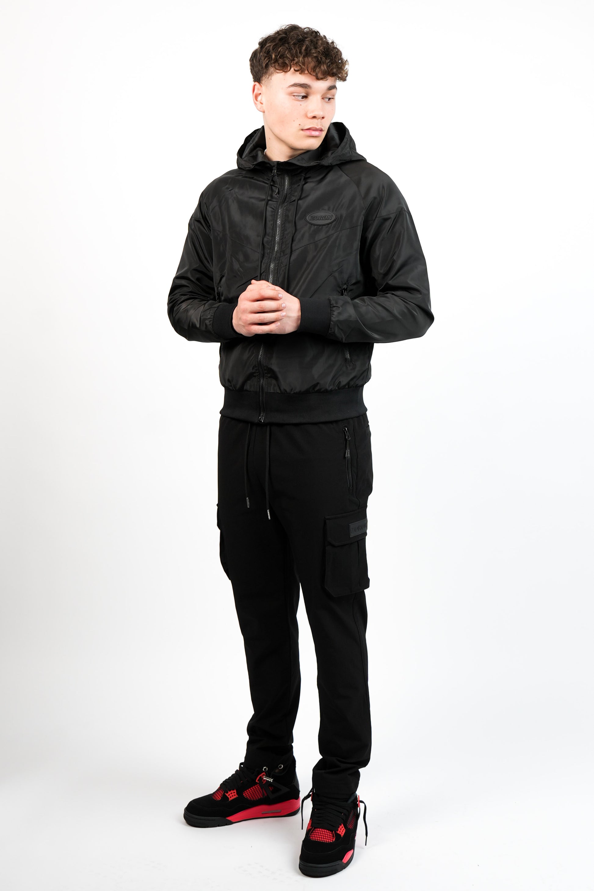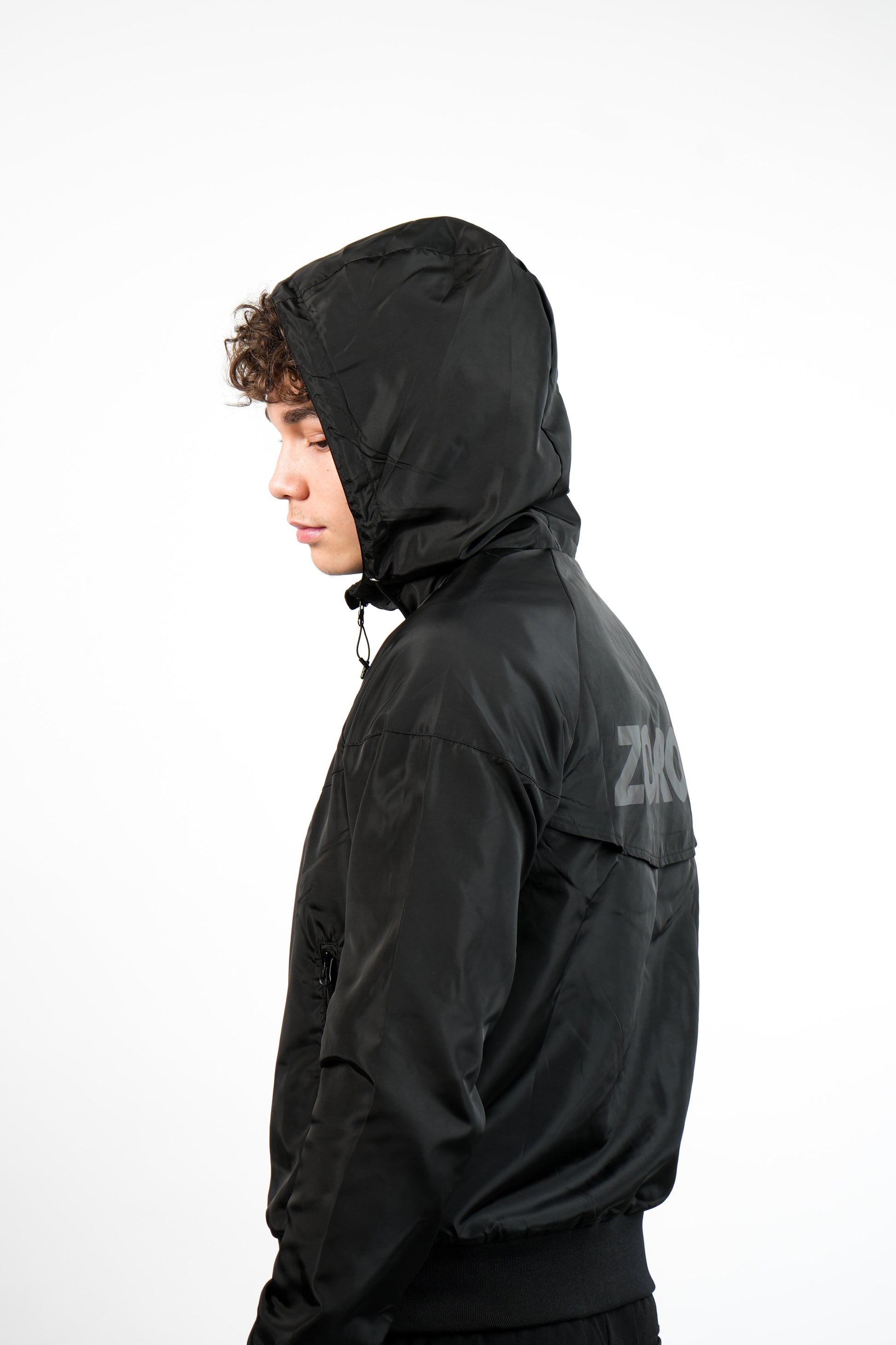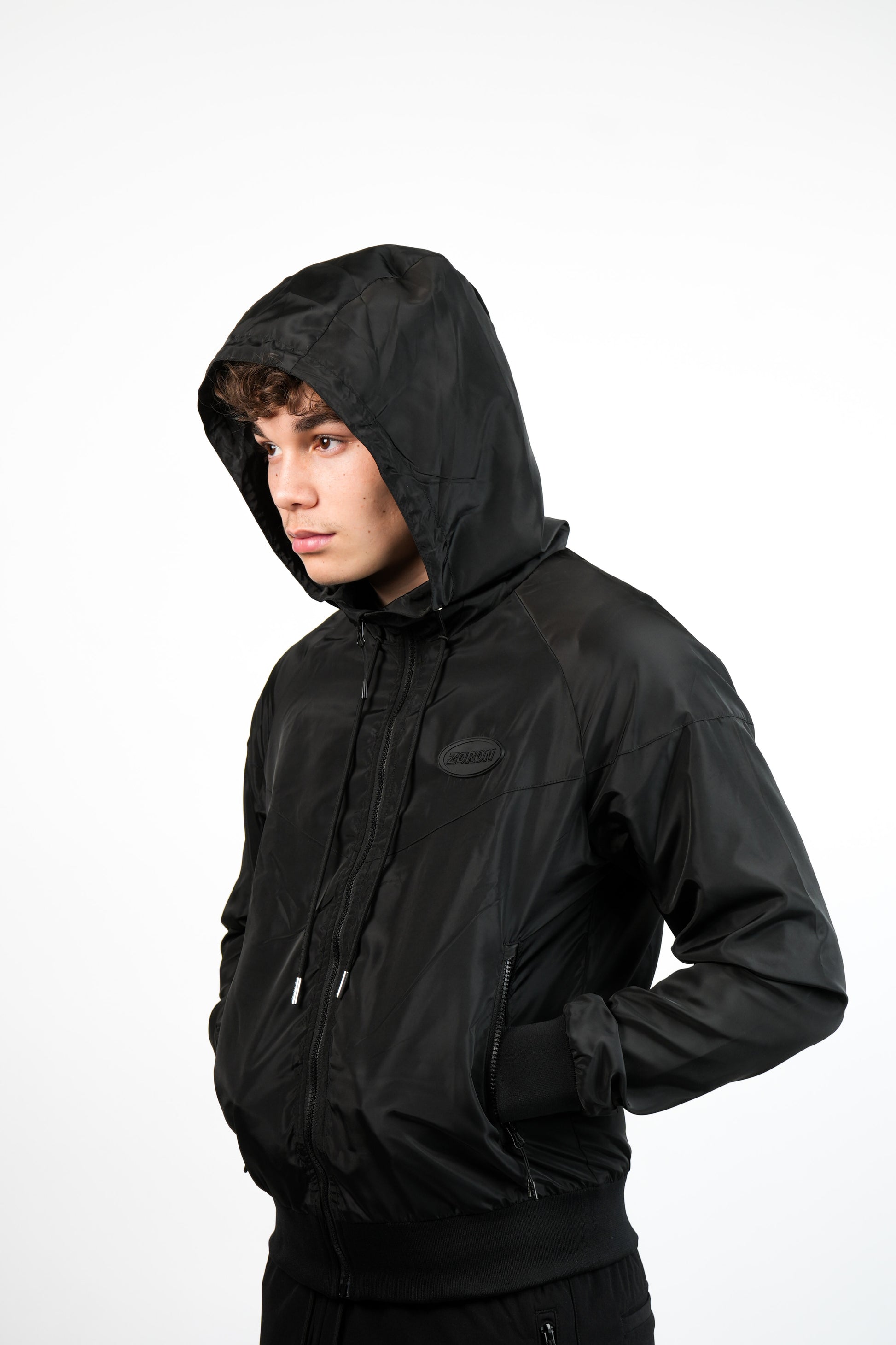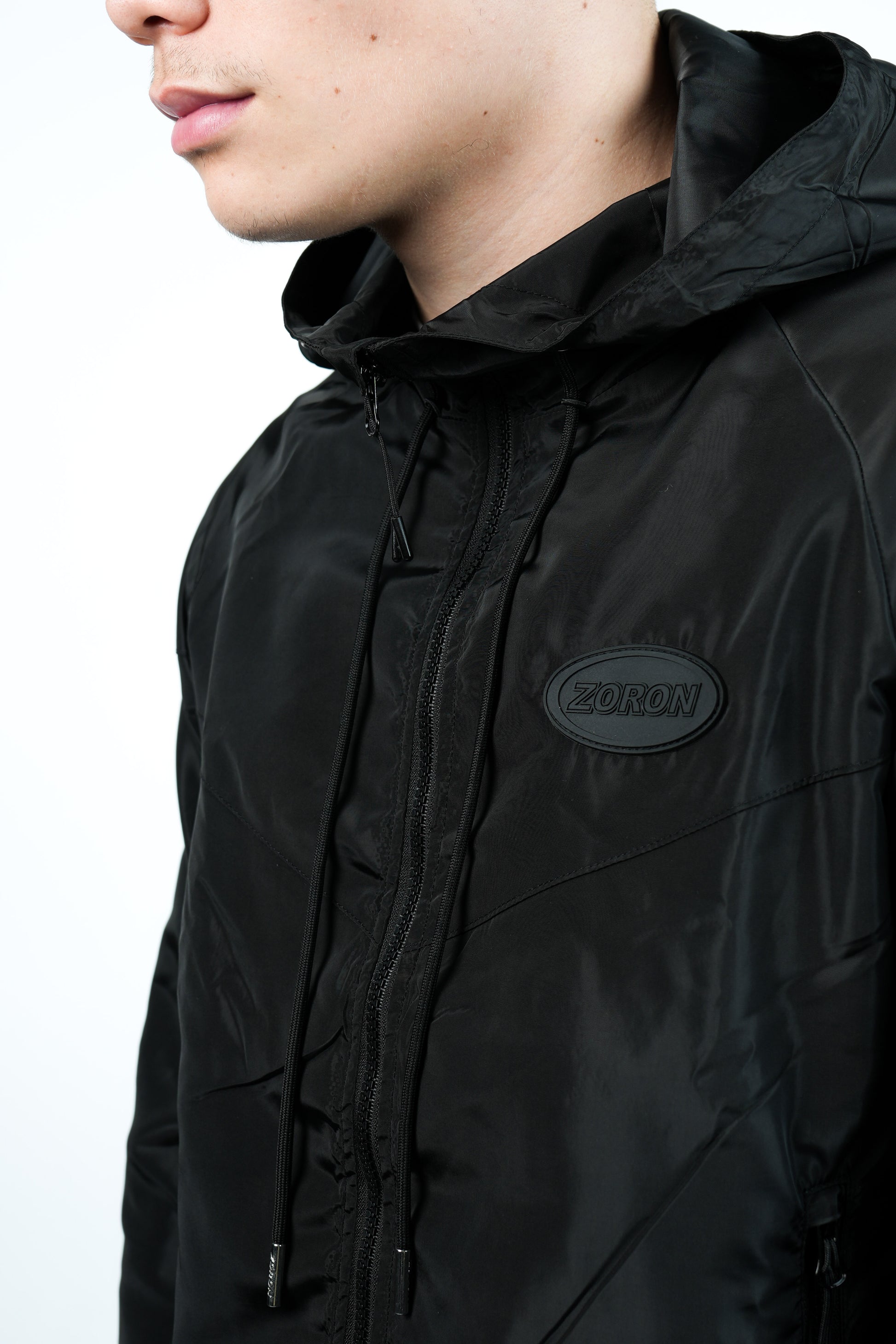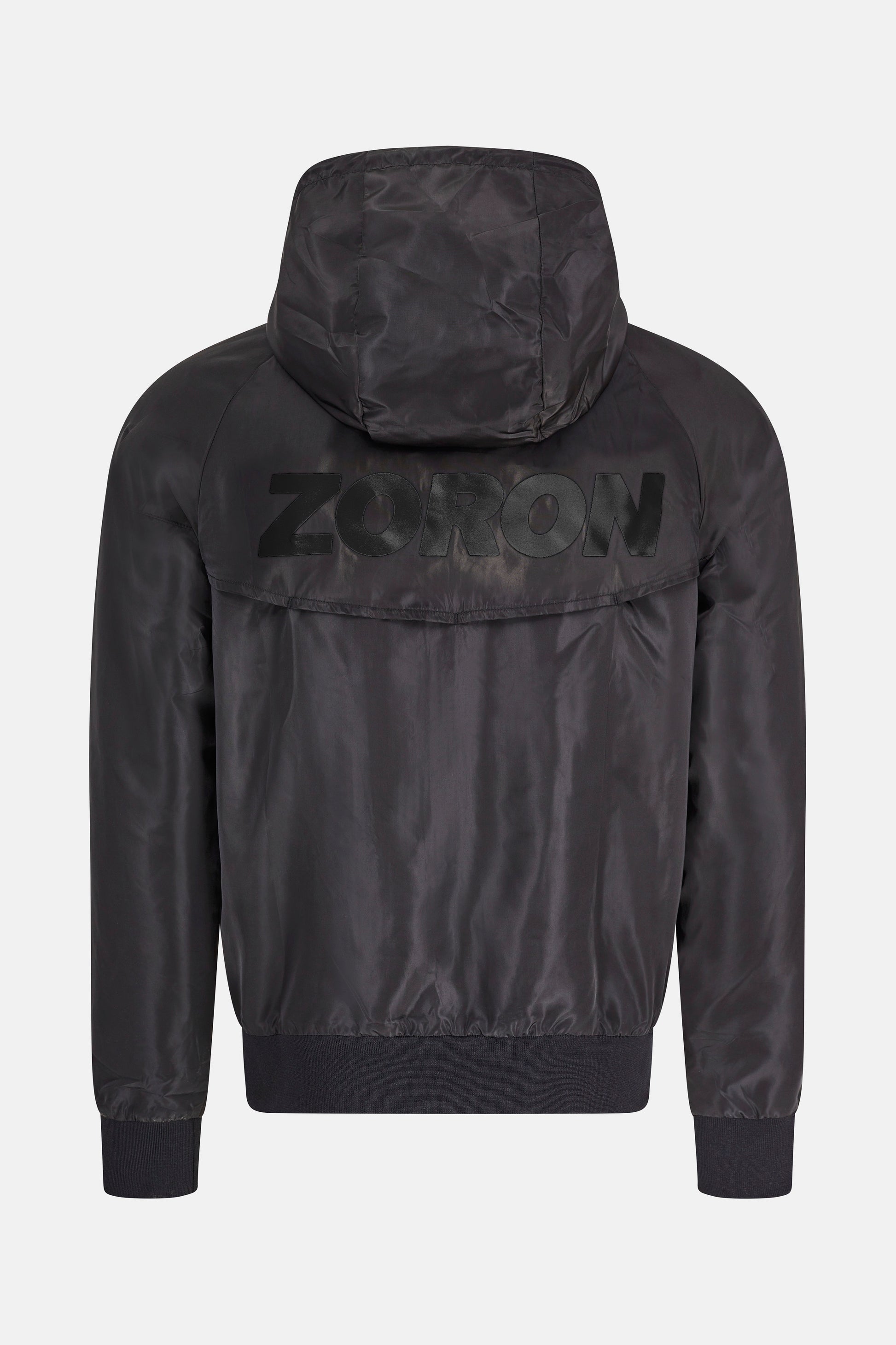 Black windbreaker made from lightweight and breathable water-repellent fabric. Detailed with Zoron rubber logo patch on chest, signature Zoron silver hardware and tonal black Zoron print on back yoke.