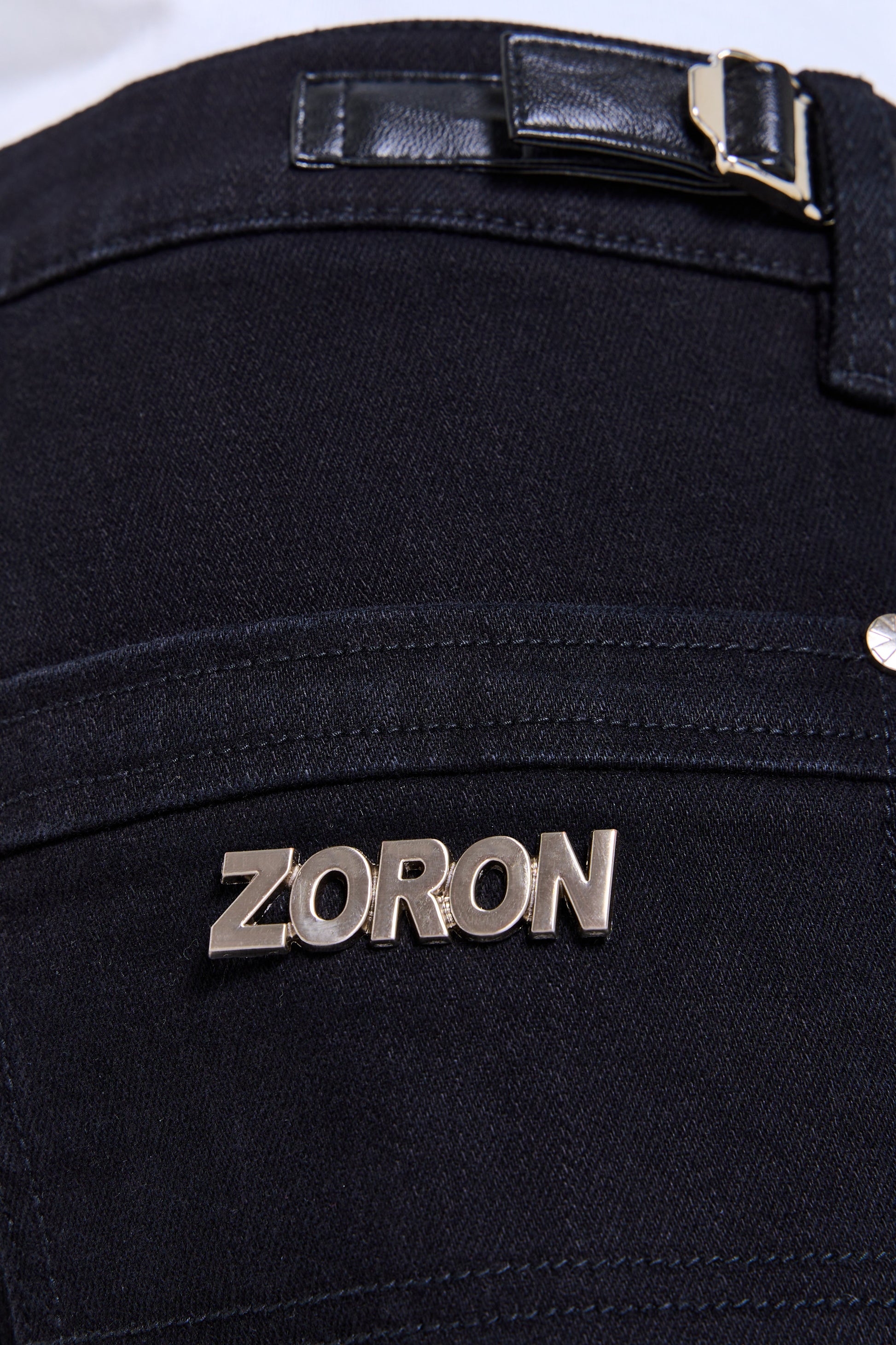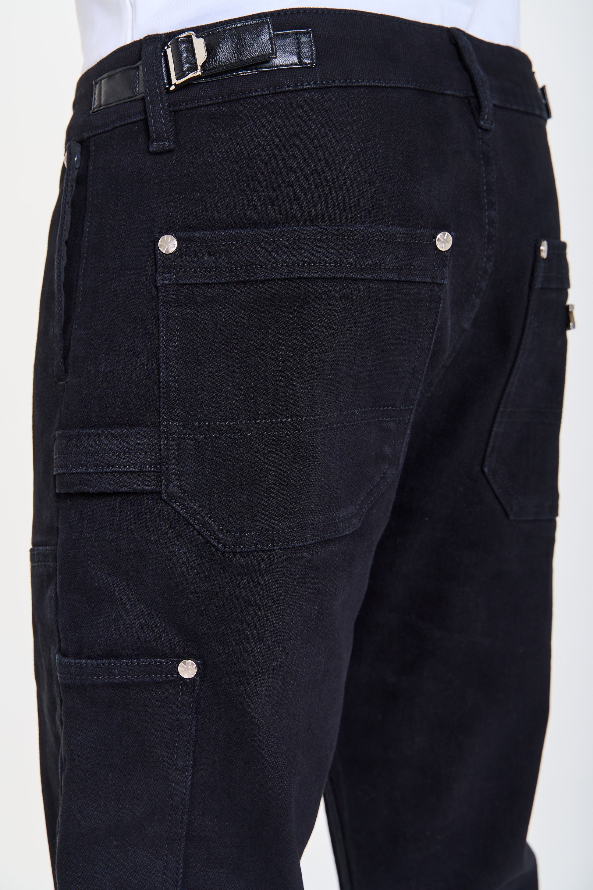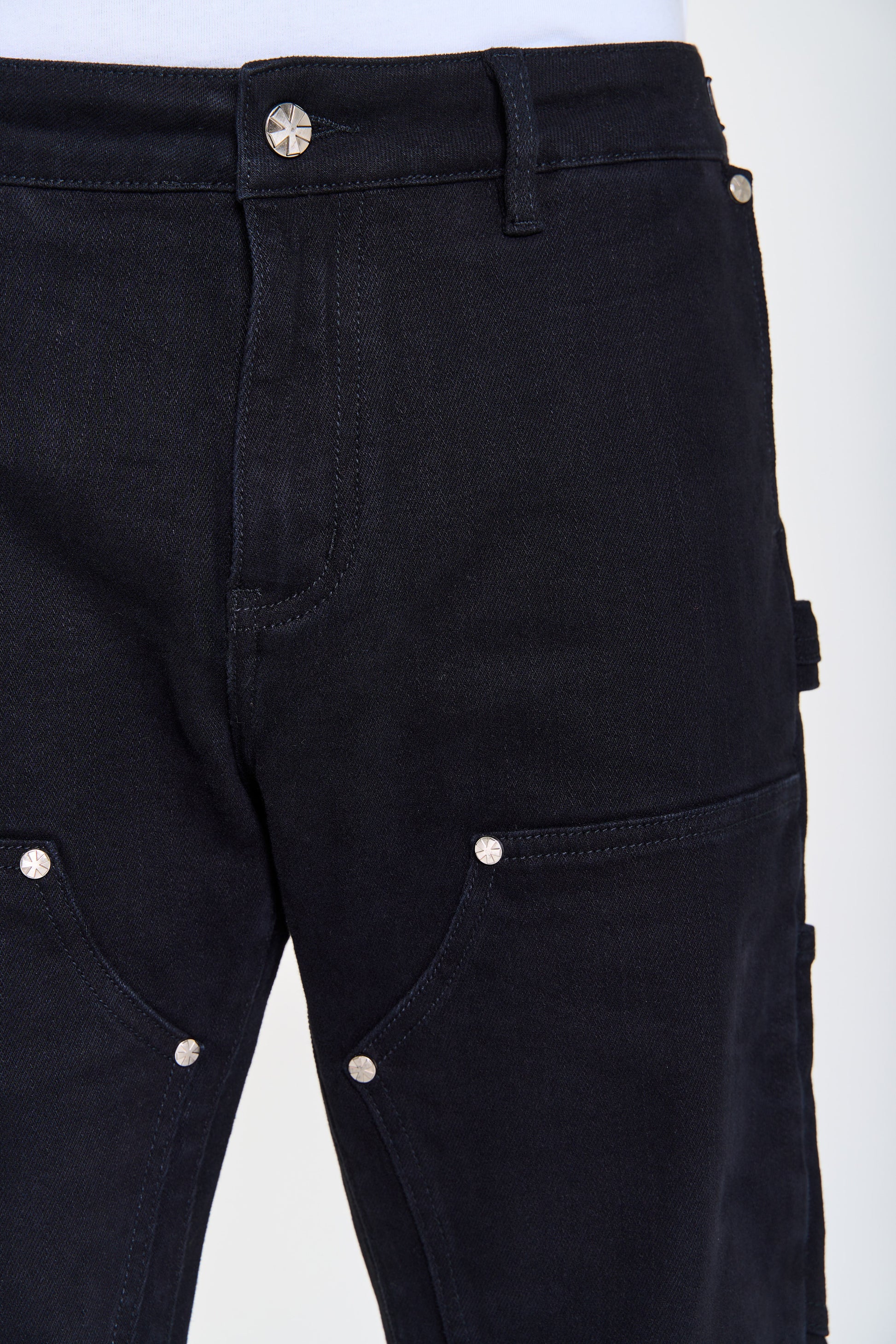 Black heavyweight carpenter jeans with slight flare opening at ankle. Features custom rivets, leather fastening on the waist and signature Zoron metal logo on back pocket.