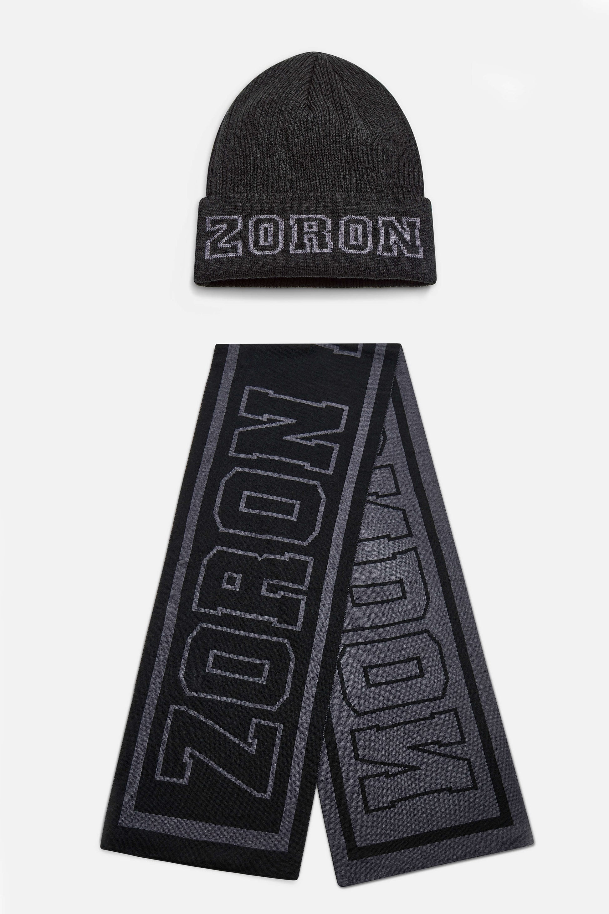 Black and Grey beanie & Scarf Set with weaved Zoron signature logo.