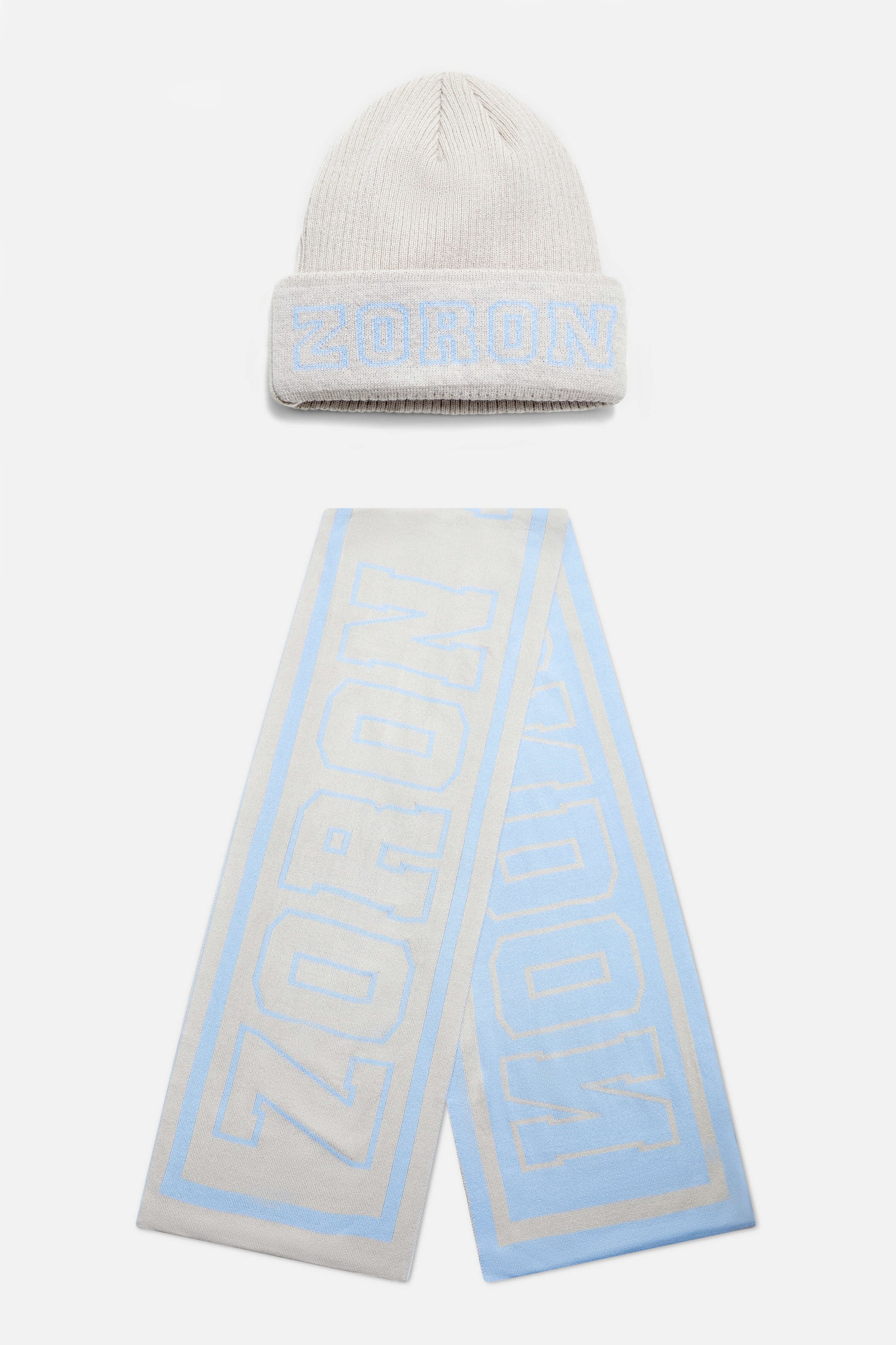 Light grey/baby blue beanie and scarf Set with weaved Zoron signature logo.
