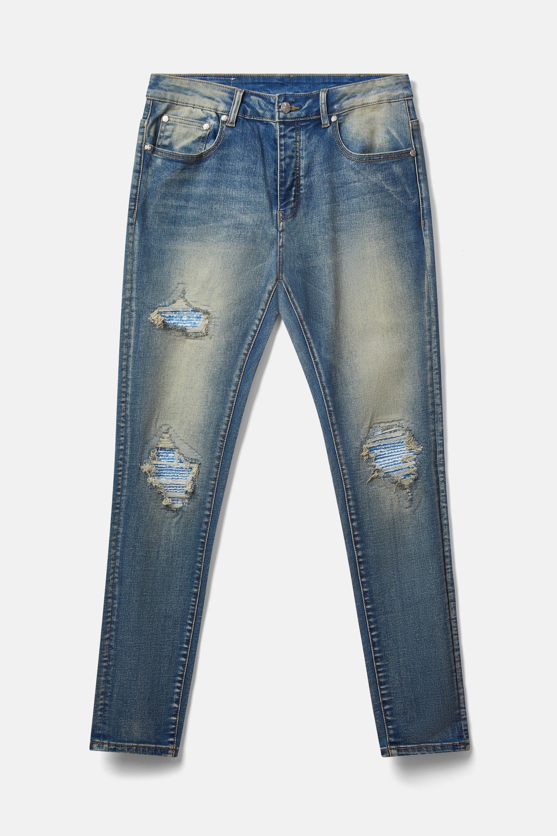 Dirty blue stretch denim with custom white/blue Zoron bandana underlay on thighs, knees and back left pocket.