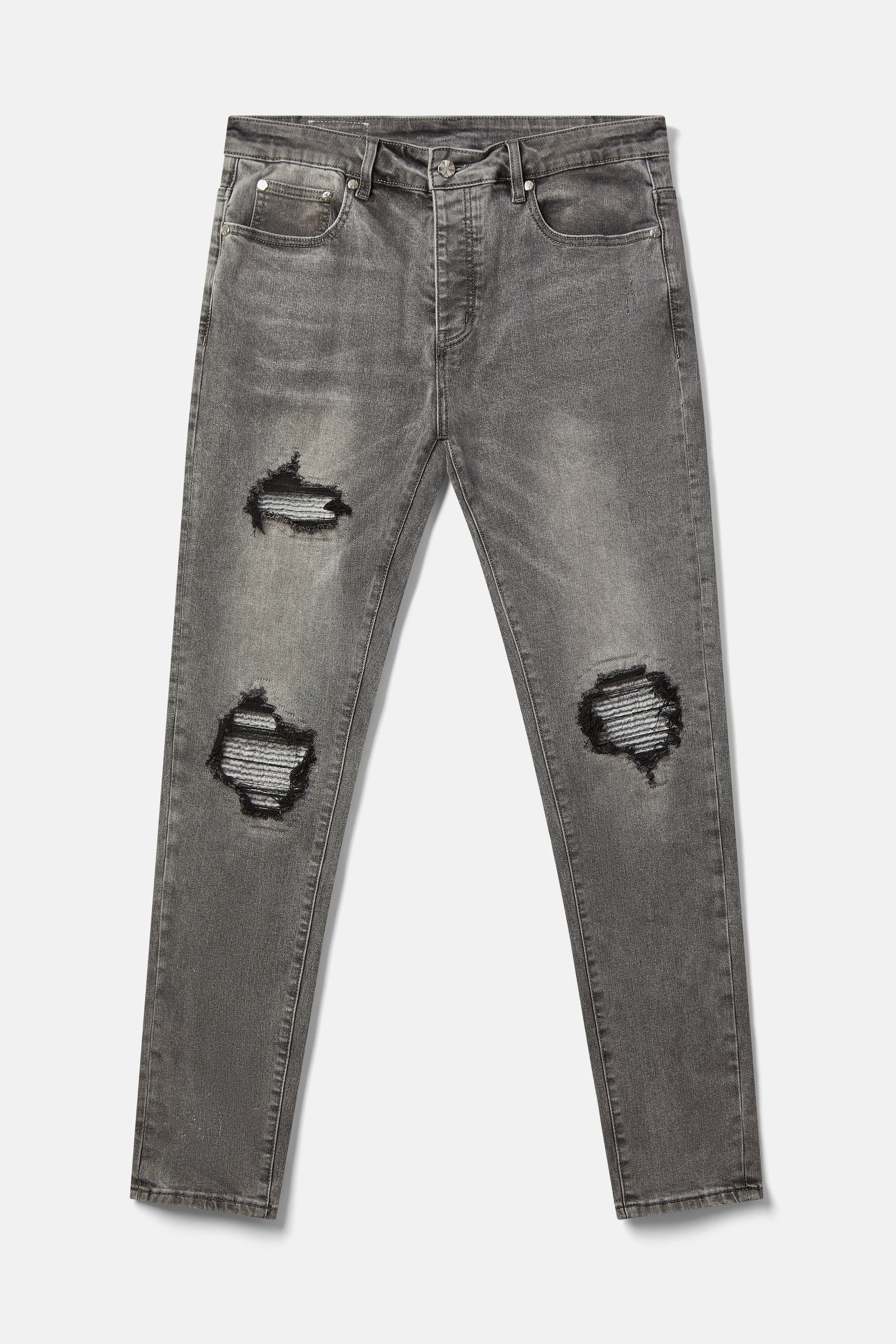 Charcoal grey stretch denim with custom grey Zoron bandana underlay on thighs, knees and back left pocket.