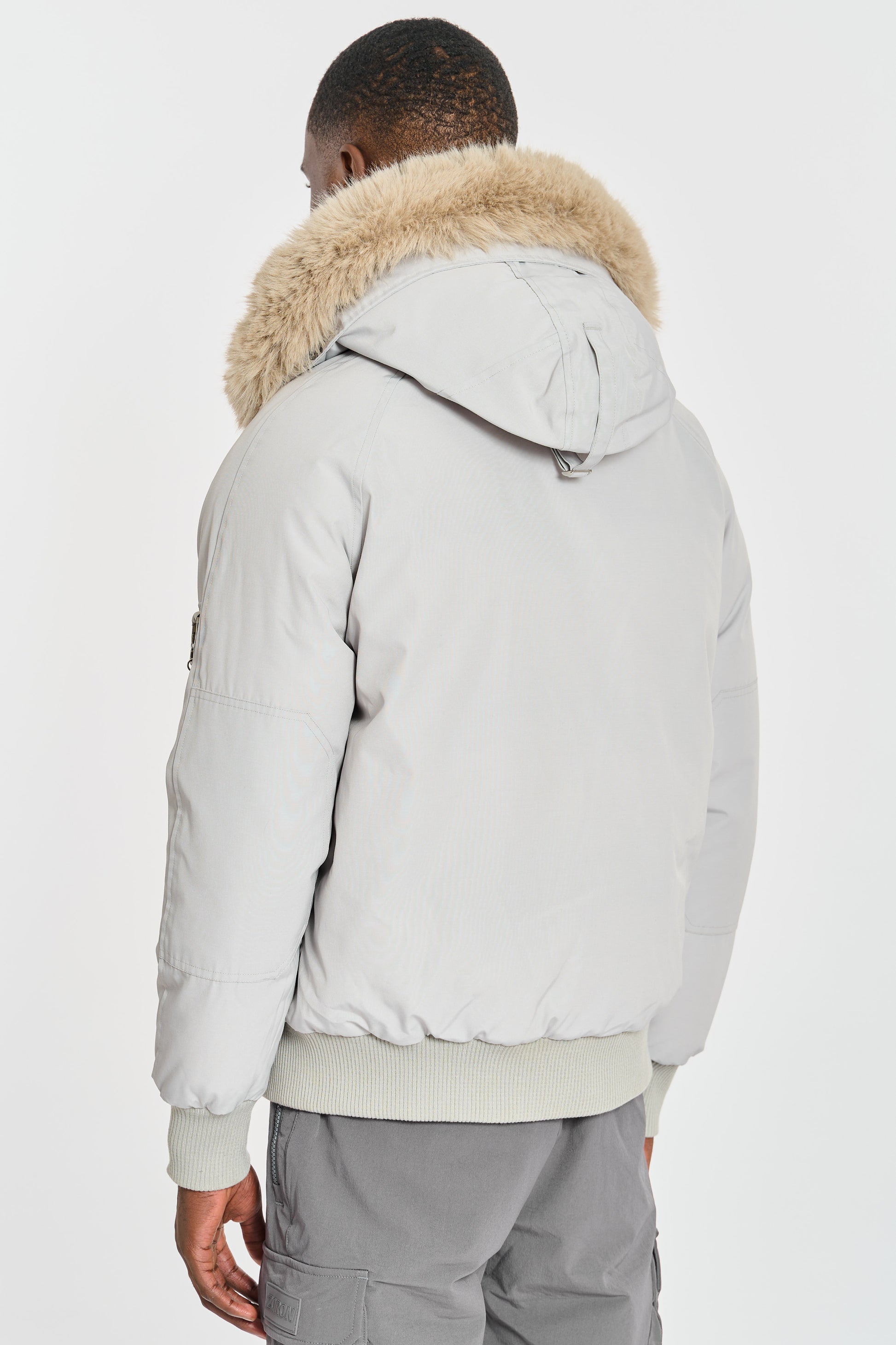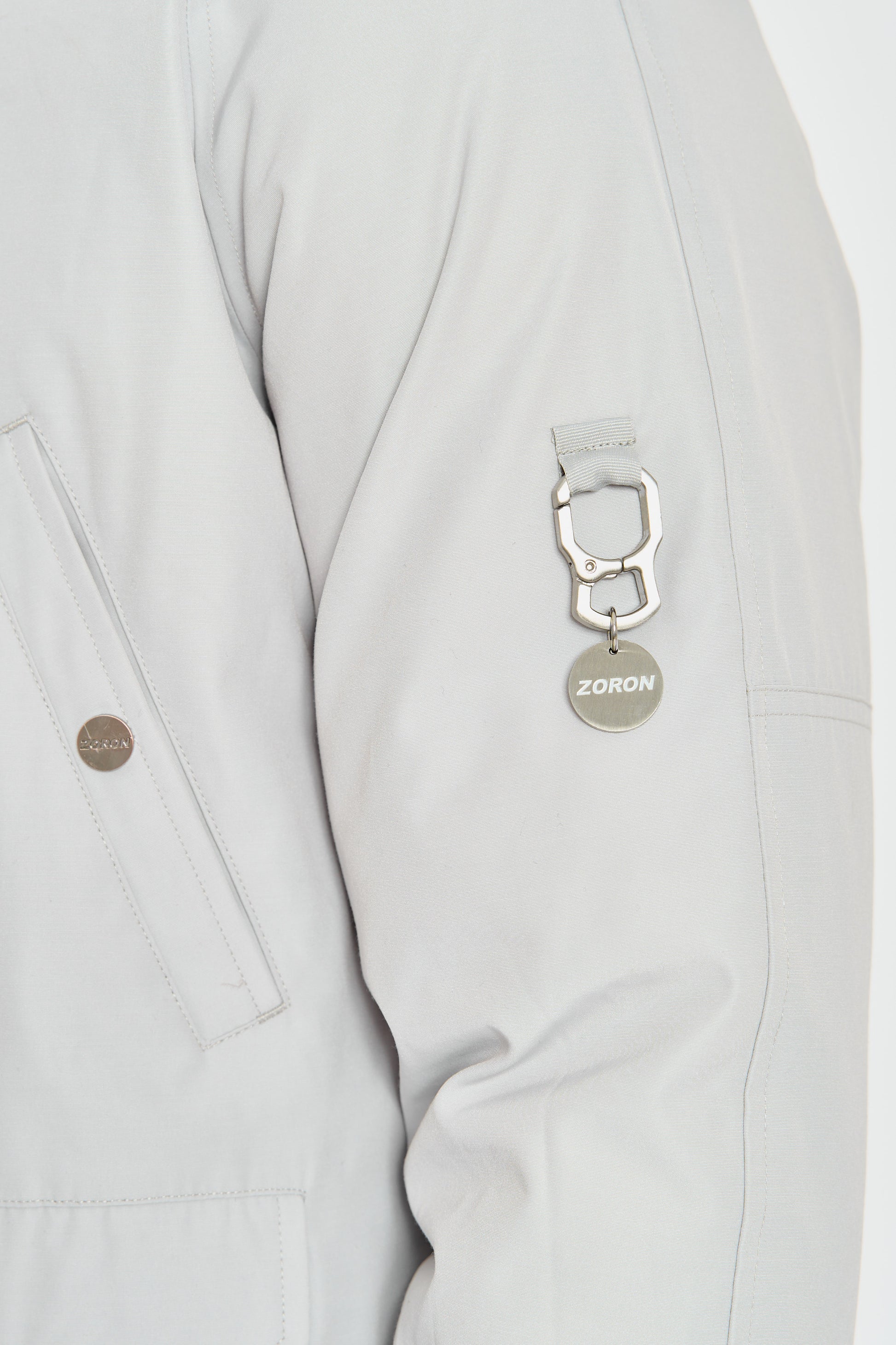 Stone water resistant Eskimo jacket featuring natural beige faux hood. Features signature Zoron key lock on left sleeve and two front slant pockets. You can also purchase purple or turquoise Eskimo separately to attach to this jacket.